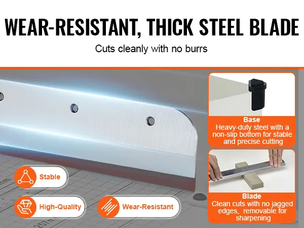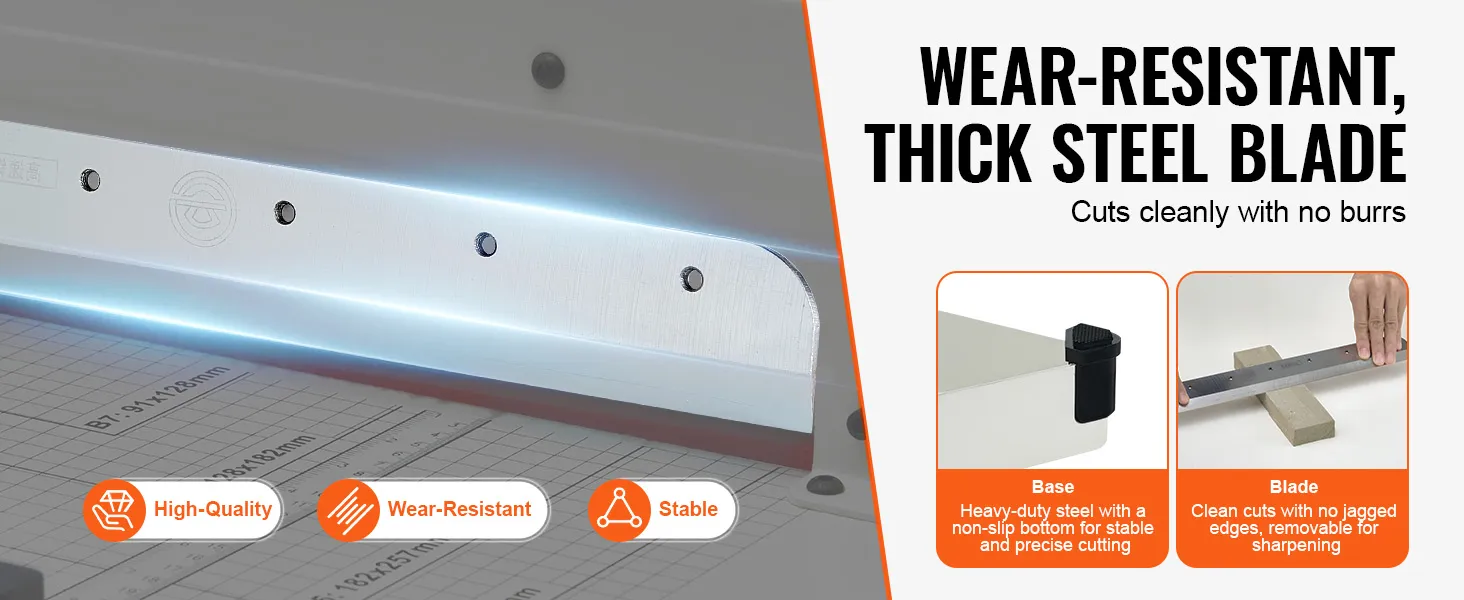 Built to Last: The hardened steel blade of our stack paper trimmer is extremely sharp, but it may wear down over time. No worries – you can easily remove it for sharpening or swap it out for a new one. The sturdy metal base provides a stable foundation, and the non-slip foot pads keep it securely in place.