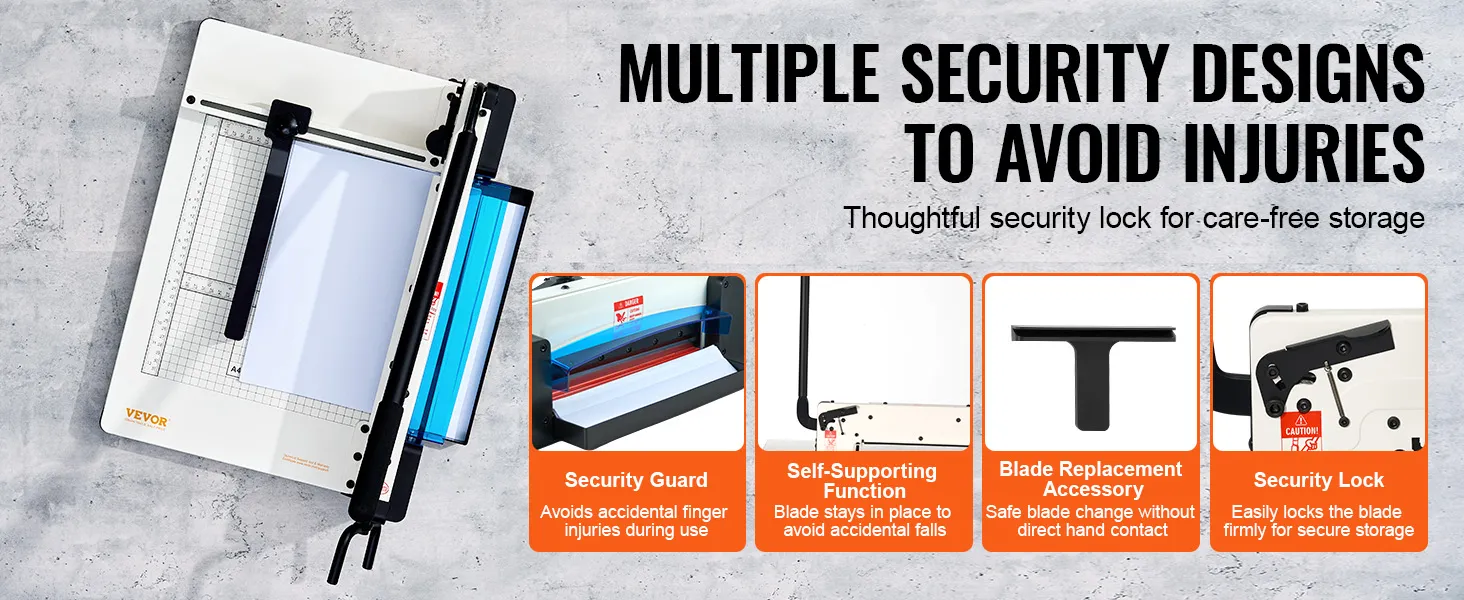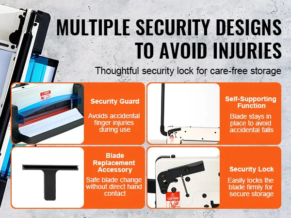 Security First: Your security matters to us. Our paper cutter guillotine features a self-supporting blade design for secure, stable cutting and a blade replacement accessory for safe blade change. Plus, it comes with a security guard and blade lock for peace of mind during use and storage.