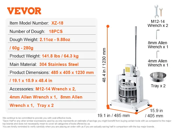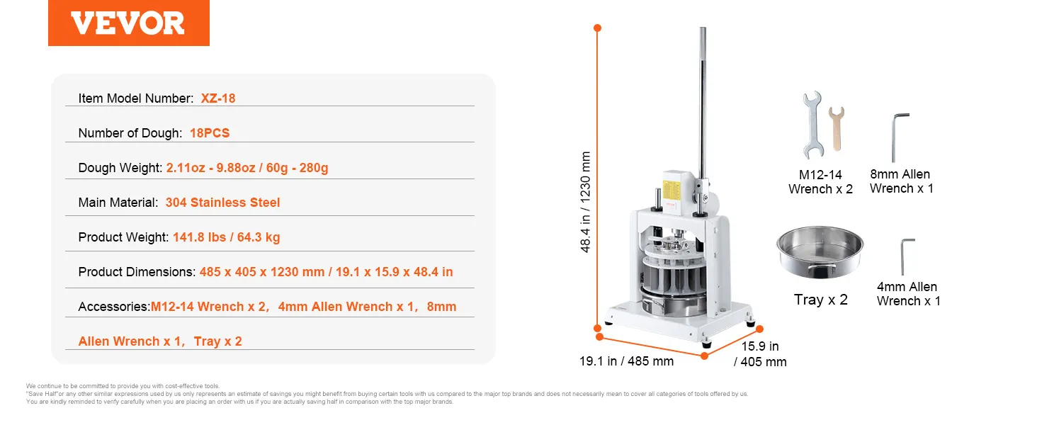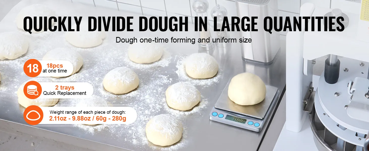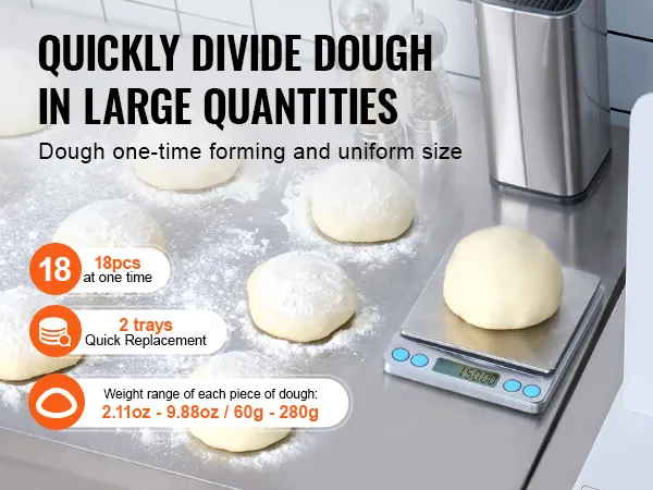 18pcs Equal: This electric dough divider can divide a large dough into 18 equal portions. Each one can range from 60 to 280 grams (2.11 to 9.88 oz). It features fast, non-stick, efficient dough dividing, avoiding the problem of unequal size caused by manual segmentation.