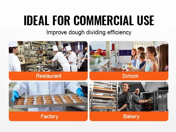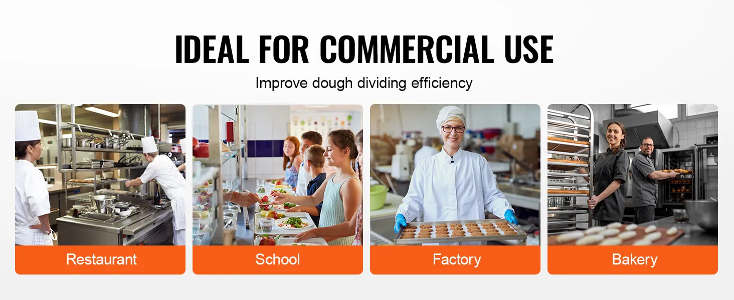 Wide Application: This dough divider is ideal for producing pastries, pizzas, cookies, burgers, bread, and more. It is suitable for use in restaurants, schools, factories, bakeries, and other high-volume food production environments.