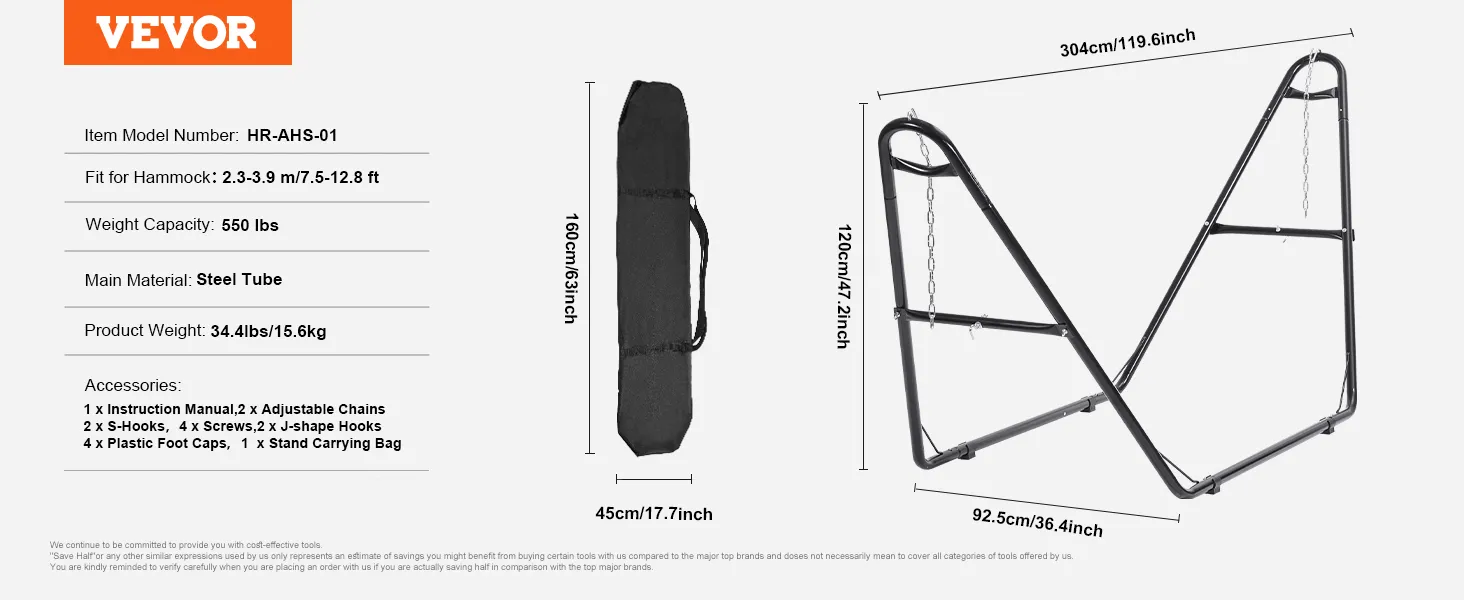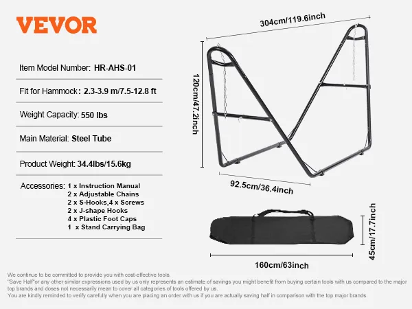Universal Fit Stand: This hammock stand accommodates various types and sizes of hammocks, suitable for hammocks ranging from 8 to 13 feet (2.3m-3.9m) in length, providing versatile usage to meet your diverse needs. Overall dimensions: 119.6'' (L) x 36.4'' (W) x 47.2'' (H).