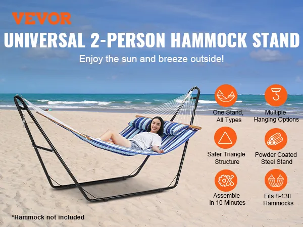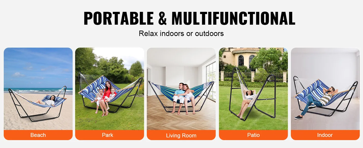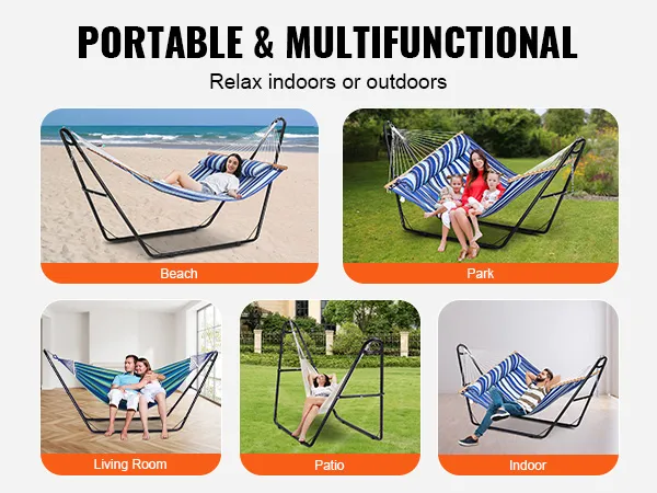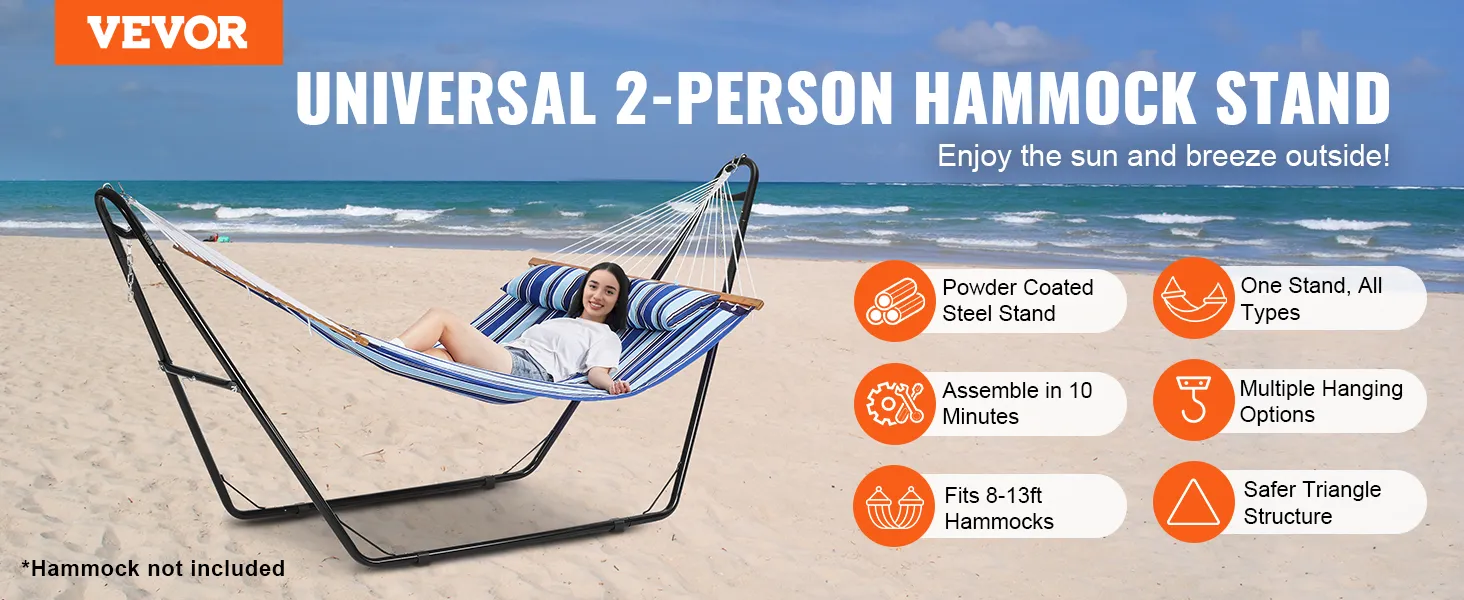 Our hammock stand for outside fits single and double hammocks from 7.5 to 12.8 feet (2.3m to 3.9m), perfect for personal relaxation or chilling with close ones. It accommodates various hammock types including Brazilian, Curved, and Spreader Bar hammocks.