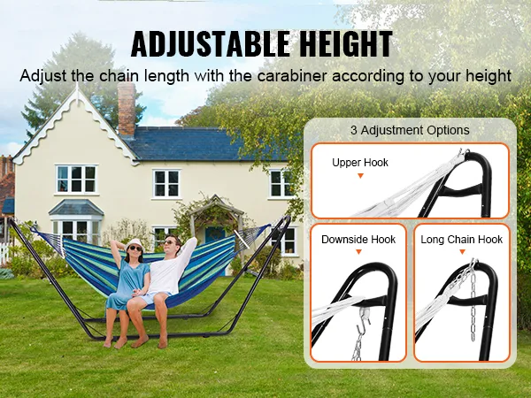 Easily adjust your hammock frame's height to meet the needs of different individuals with three adjustment options: Upper Hook, Downside Hook, and Long Chain Hook. This allows you to find the comfortable height, ensuring an optimal experience every time you use it.