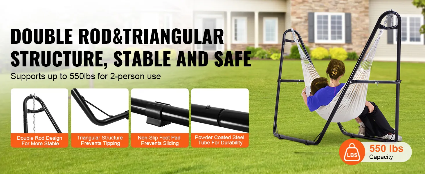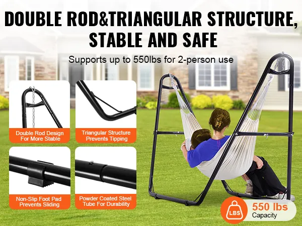 550 lbs Capacity & Stability: Reinforced with dual rods on each side and a rod between each leg and the bottom tube, forming a robust double rods and triangular structure capable of supporting up to 550 lbs. The non-slip pads of the portable hammock stand ensure stability and safety, especially when children climb in and out.