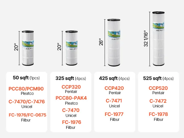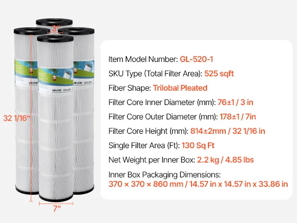 Compatibele vervangende modellen: Het GL-520-1 zwembadwaterfilter is compatibel met de volgende modellen: VEVOR GL-520-1, Pentair CCP520, R173578, PCC130, Ultraf-A7, Unicel C-7472, Filbur FC-1978, FC-6475. Let op: Dit is een compatibel accessoire van derden. De vermelde merken en modellen dienen slechts ter referentie. VEVOR is een onafhankelijk merk.