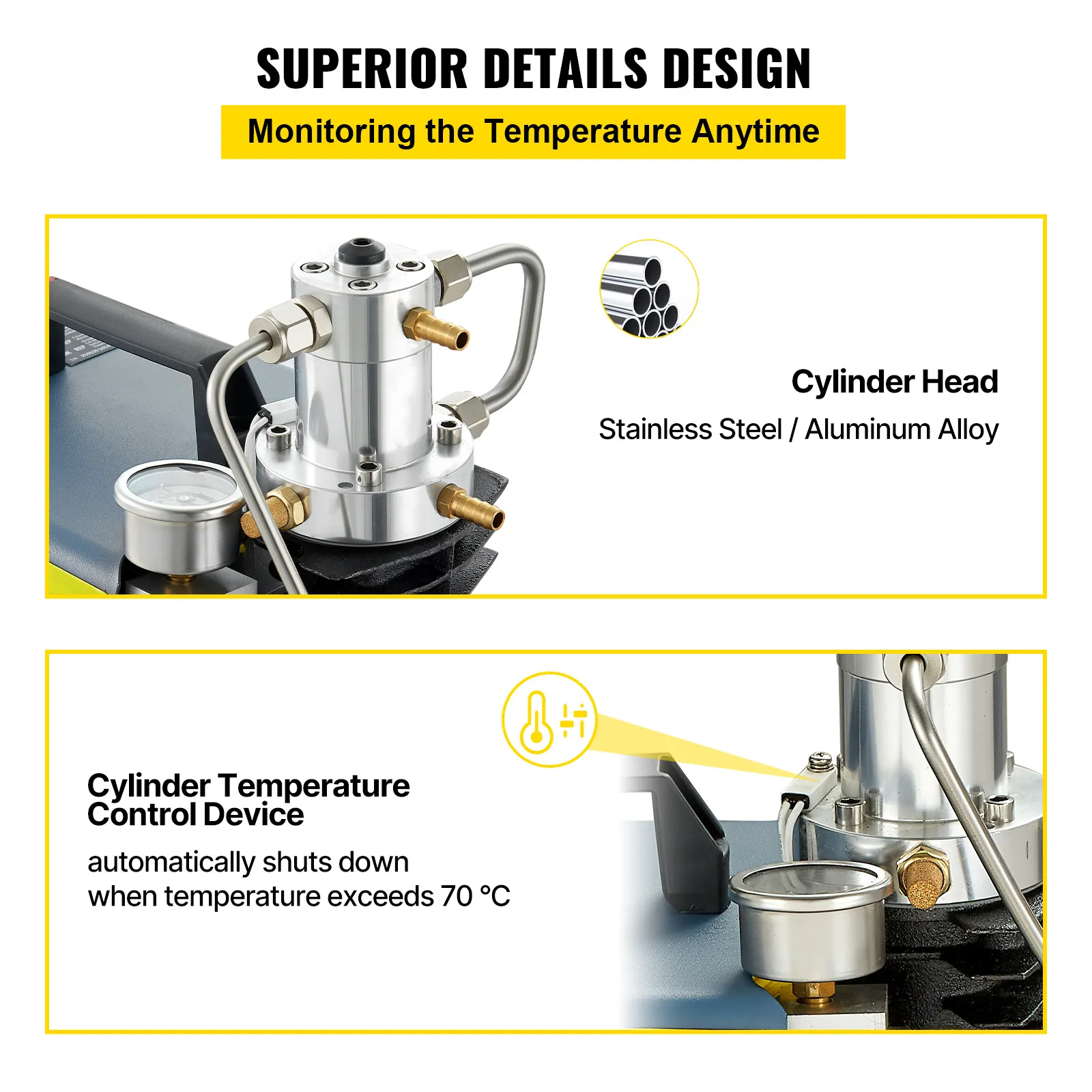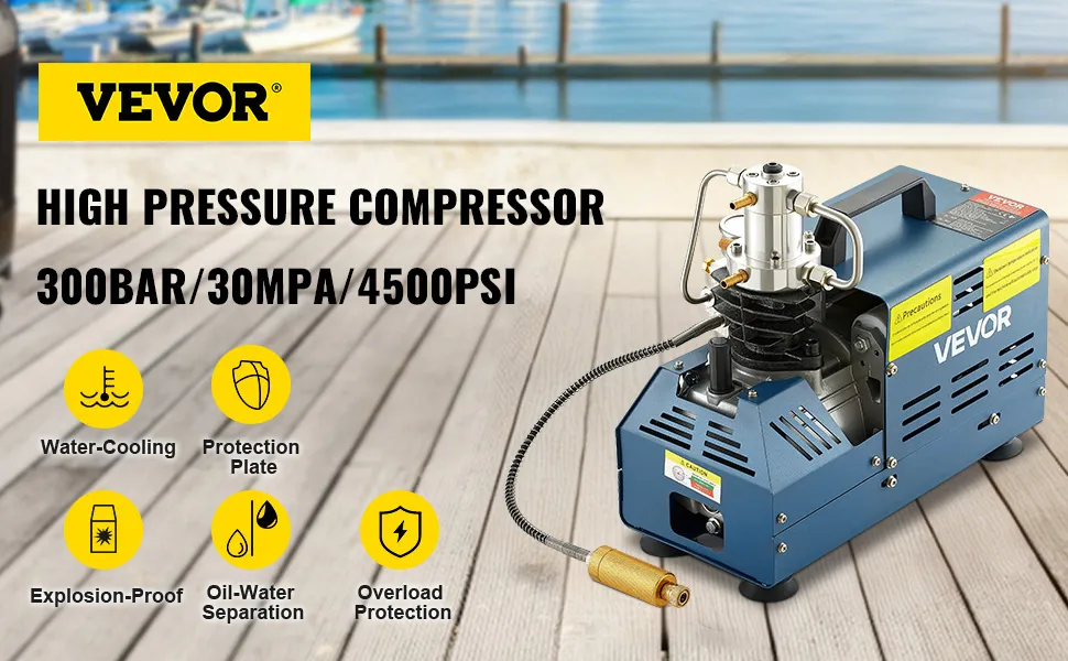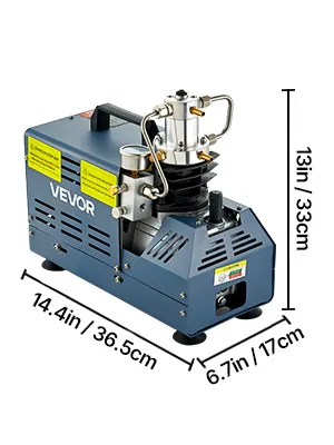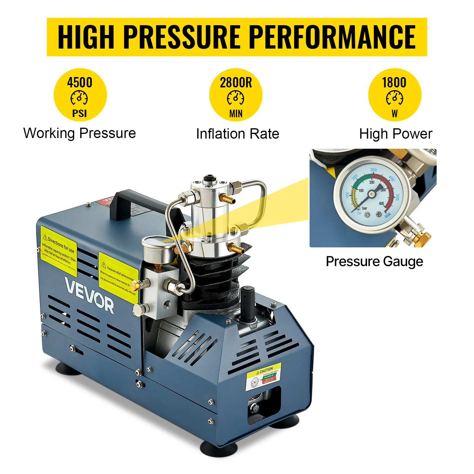 De pomp is een 1800W PCP-compressor met tweetraps compressie. De maximale werkdruk is 4500PSI. Wanneer de vereiste druk is bereikt, moet u de machine handmatig stoppen om gevaren te voorkomen. De compressor maakt gebruik van een olie / waterafscheider filtratie- en waterkoelsysteem, zorgt voor stabiele prestaties en een lange levensduur. Daarnaast is de compressor voorzien van een verbeterde LED-temperatuurweergave, explosieveilige klep en roestvrijstalen cilinder. Geschikt voor duikfles, PCP-luchtgeweer, paintballtank, duikfles, luchtpistool, enz.