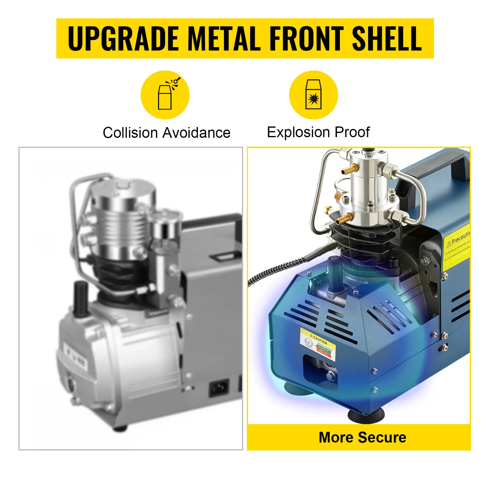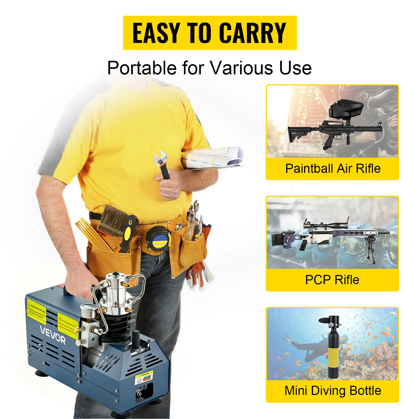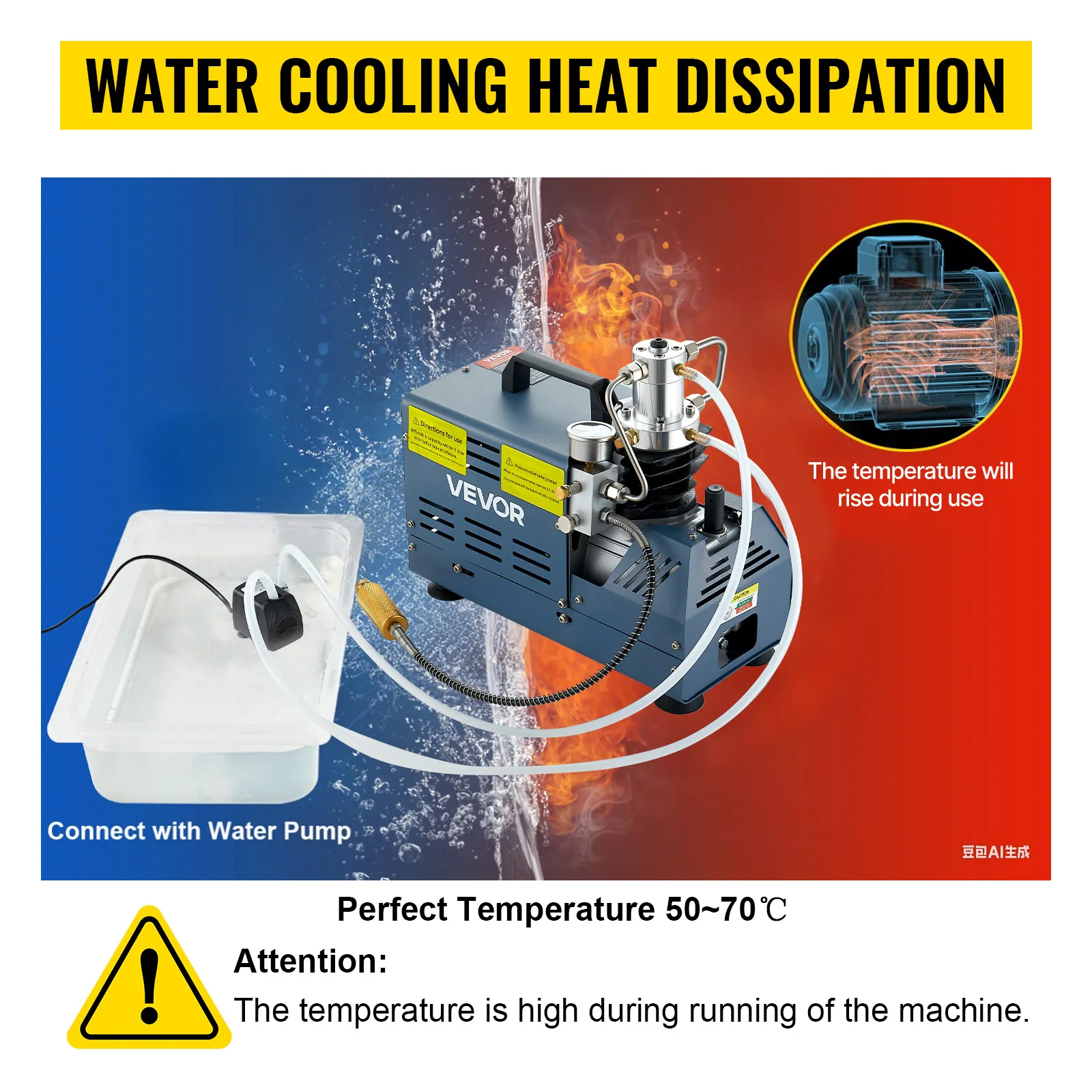 De pomp is een 1800W PCP-compressor met tweetraps compressie. De maximale werkdruk is 4500PSI. Wanneer de vereiste druk is bereikt, moet u de machine handmatig stoppen om gevaren te voorkomen. De compressor maakt gebruik van een olie / waterafscheider filtratie- en waterkoelsysteem, zorgt voor stabiele prestaties en een lange levensduur. Daarnaast is de compressor voorzien van een verbeterde LED-temperatuurweergave, explosieveilige klep en roestvrijstalen cilinder. Geschikt voor duikfles, PCP-luchtgeweer, paintballtank, duikfles, luchtpistool, enz.