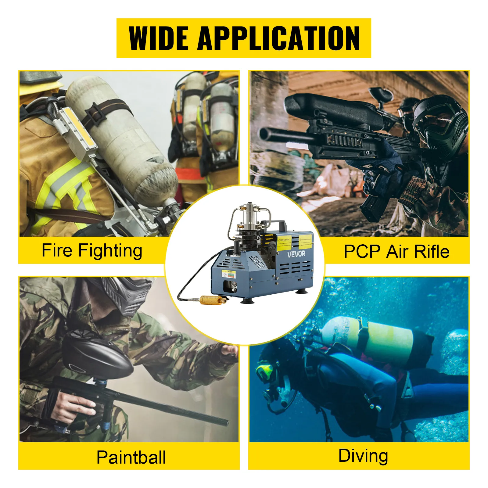 Deze scuba-luchtcompressor is voorzien van olie- en waterafscheiderfiltratie. Schone lucht wordt afgevoerd door de machine, geschikt voor de mini-duikfles, PCP-geweer, paintballtank, luchtpistool, paintball-luchtgeweer, brandbestrijding, lekdetectie, drukdichte test, luchtdichtheidstest, enz.