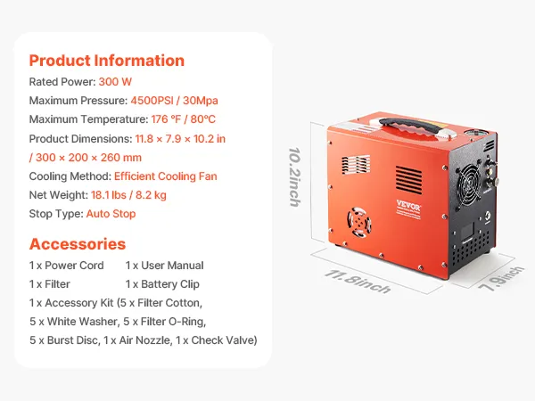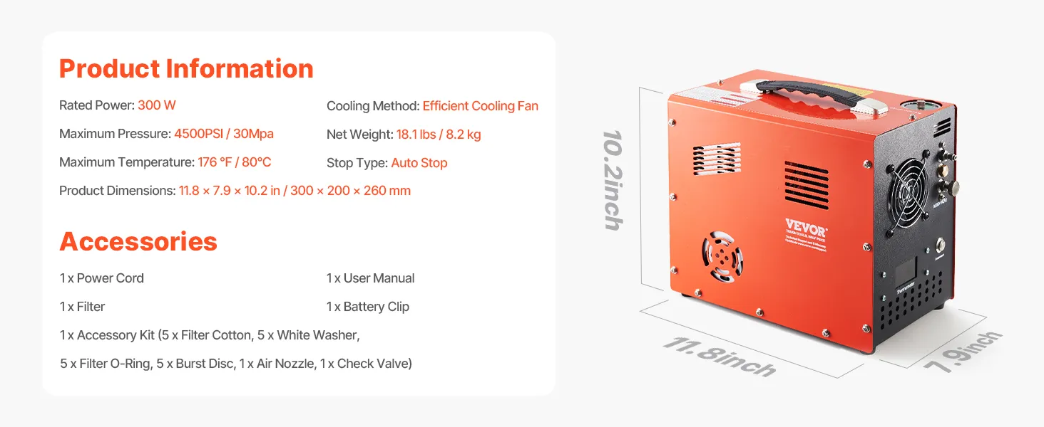 Geniet altijd en overal van een betrouwbare luchttoevoer met onze PCP-luchtcompressor. Dankzij de geïntegreerde omvormer zijn er twee oplaadmogelijkheden: DC12V en AC230V. Profiteer van snel en stabiel opblazen met automatische stop, maximale druk van 4500 PSI/30 MPa, ingebouwd ventilatorkoelsysteem en realtime drukweergave.