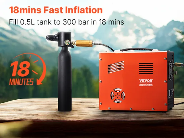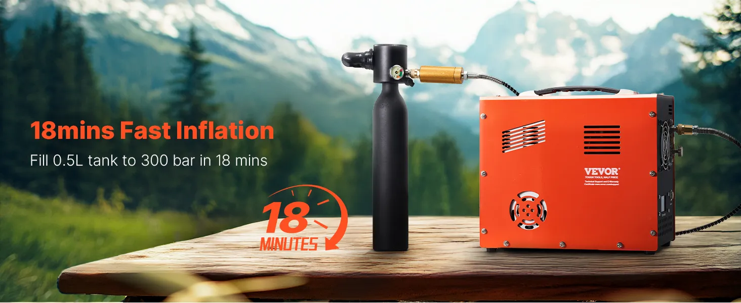 Deze 300W PCP-luchtbukspomp vult een luchtfles van 0,5 liter efficiënt van 0 tot 300 bar in slechts 18 minuten. Zo bespaart u tijd en bent u klaar voor uw volgende avontuur.