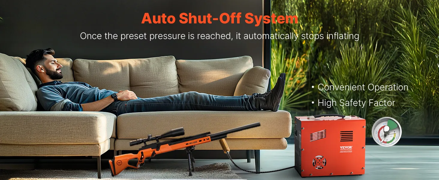 Snelle opblazing met auto-stop: geen lange wachttijden meer. Onze 300W PCP-luchtcompressor kan moeiteloos een luchtfles van 0,5 liter opblazen van 0 tot 300 bar in slechts 18 minuten. Zodra de vooraf ingestelde druk is bereikt, schakelt het apparaat automatisch uit. Zo kunt u eenvoudig uw paintballgeweren, PCP-geweren en duikflessen opblazen.