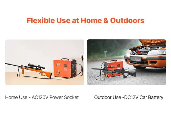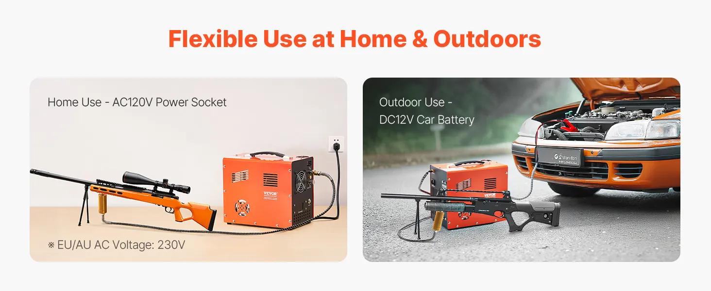 Veelzijdig gebruik thuis en buitenshuis: Dankzij de ingebouwde spanningsomvormer kan deze PCP-luchtbukscompressor zowel via een 230 V AC-stopcontact thuis als via een 12 V-autoaccu buitenshuis worden gevoed. Koop deze compacte luchtpomp, of u nu thuis bent of in de buitenlucht, u hebt altijd stroom binnen handbereik.