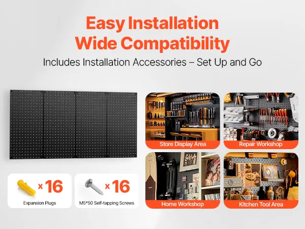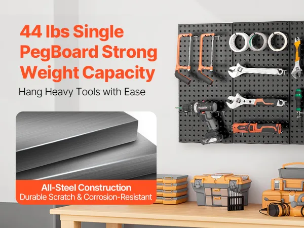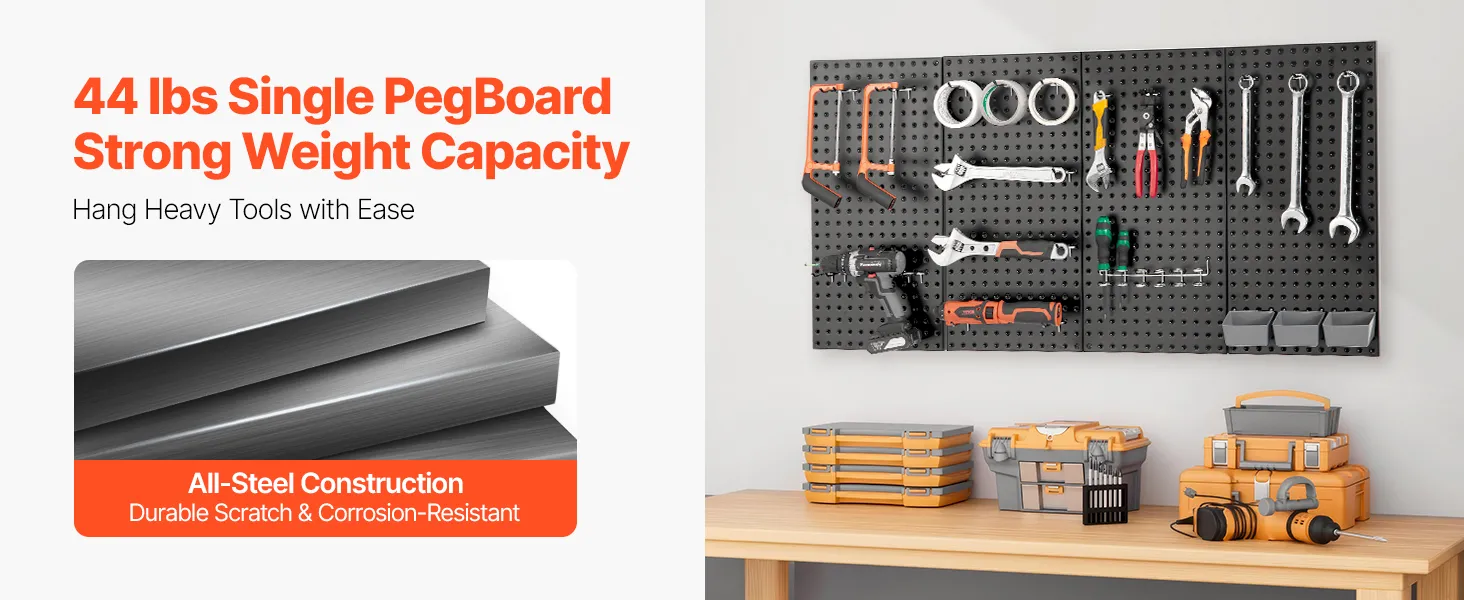 This set of metal pegboard panels is ideal for a variety of spaces, including garages, hardware stores, and home workshops. Built to handle heavy loads and designed for durability, it provides flexible storage for all your tools, catering to your diverse needs in different work environments.