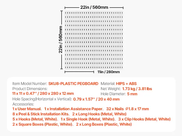 Deze perforatiebordorganizer is gemaakt van hoogwaardig HIPS-materiaal en heeft een robuust draagvermogen van maximaal 9 kg per paneel, wat zorgt voor een uitstekende stabiliteit.