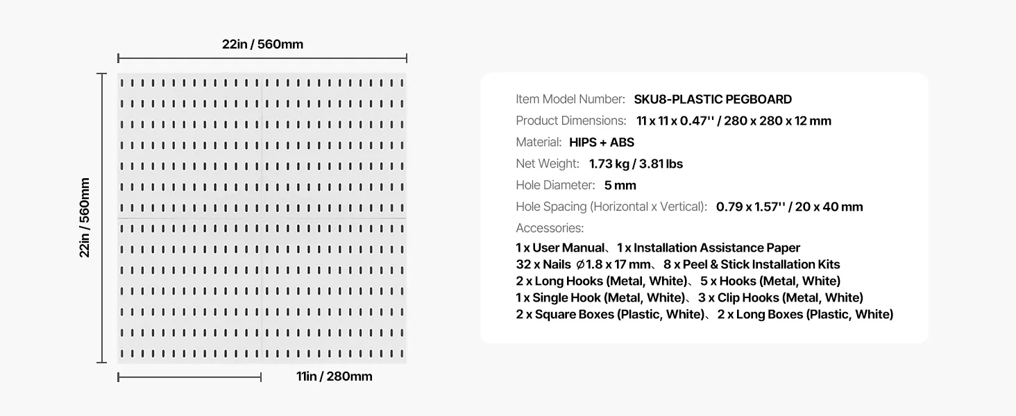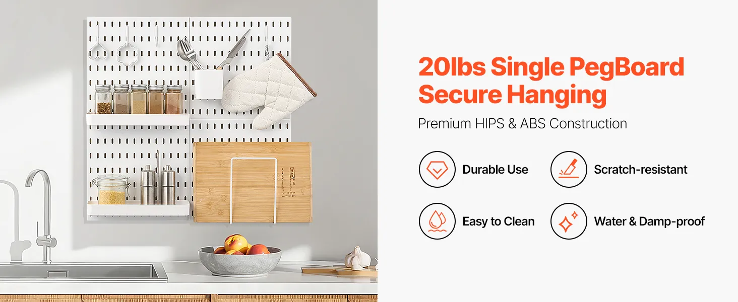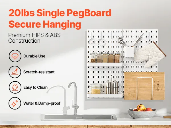 Stabiel draagvermogen: Deze pegboard organizer is gemaakt van hoogwaardige ABS/HIPS-materialen en heeft een sterk draagvermogen van maximaal 9 kg per paneel. Hierdoor kunt u zware voorwerpen ophangen zonder dat u zich zorgen hoeft te maken dat ze vallen of beschadigd raken.