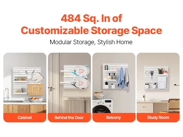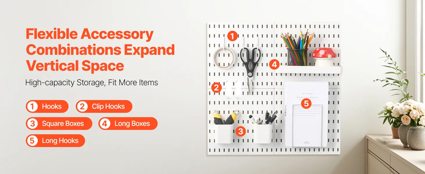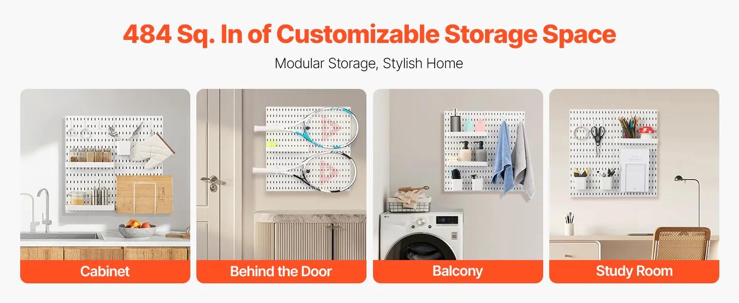 Veelzijdige functionaliteit: Deze combinatieset met geperforeerde wanden kan voor meerdere doeleinden worden gebruikt en gepersonaliseerde opbergruimte creëren voor verschillende behoeften. Of het nu gaat om het tentoonstellen van accessoires in de slaapkamer of het ordenen van kruiden in de keuken, het kan allemaal met gemak.