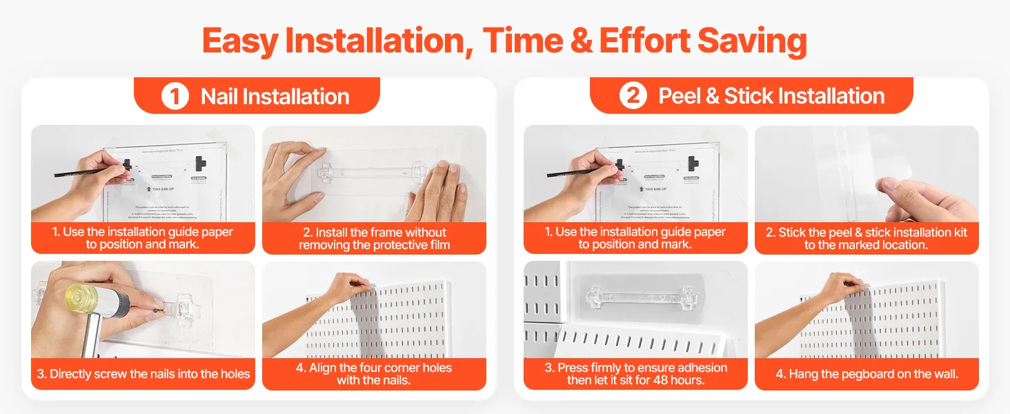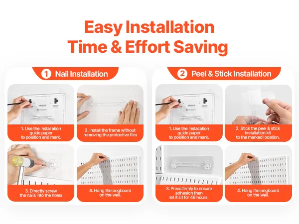 Eenvoudige installatie: Er zijn verschillende installatieopties beschikbaar. Of u het gaatjesbord nu direct aan de muur wilt spijkeren of met lijm wilt bevestigen, dankzij de meegeleverde instructies is de installatie snel en eenvoudig.