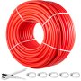 Rode VEVOR pex-buisrol met witte banden, pijpsnijder en vijf klemmen. Ideaal voor loodgietersinstallaties.