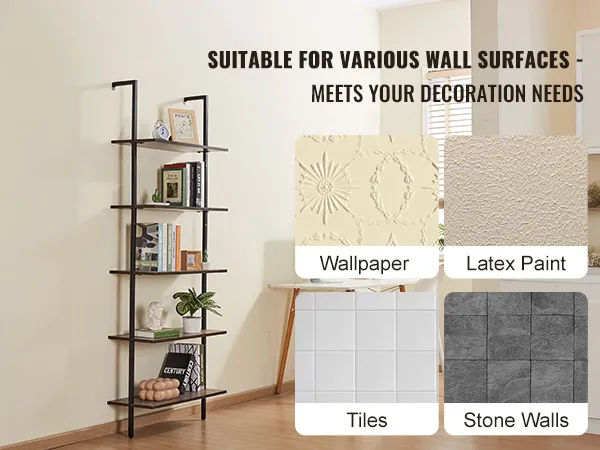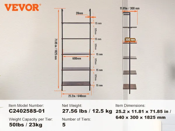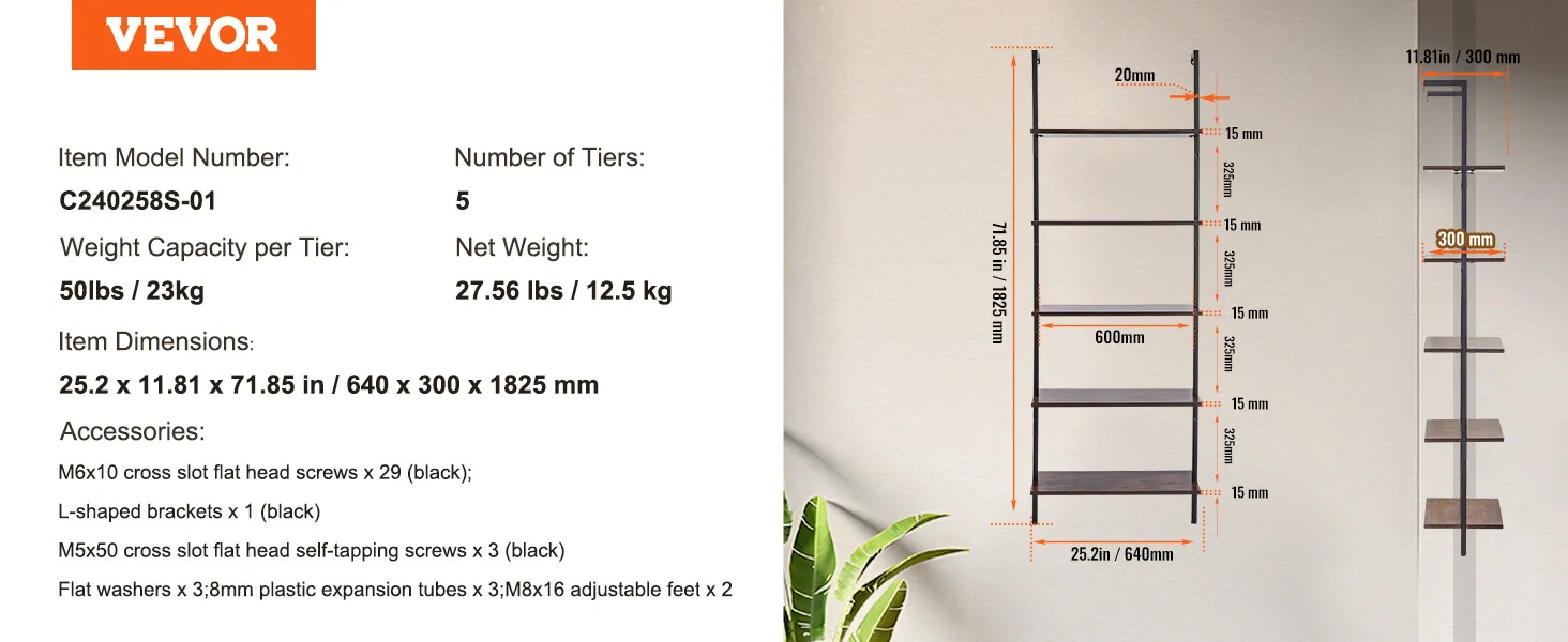 VEVOR Ladderplank met metalen frame, 5 niveaus, wandgemonteerde boekenplank, 64x30 cm, zwevende houten planken, opbergrek, houder voor kleine spullen voor keuken, slaapkamer, badkamer, woonkamer, zwart