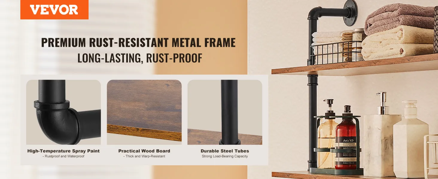 Strong Load Capacity: Constructed with a sturdy metal pipe structure and thickened wood boards, each shelf can hold up to 30 lbs, meeting various storage needs. Whether for books, frames, kitchenware, or towels, keep your space organized and clutter-free!