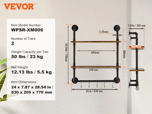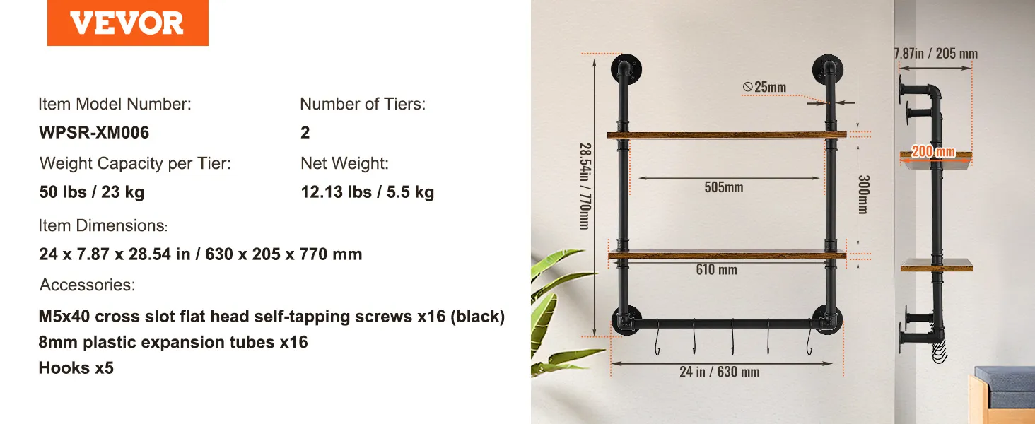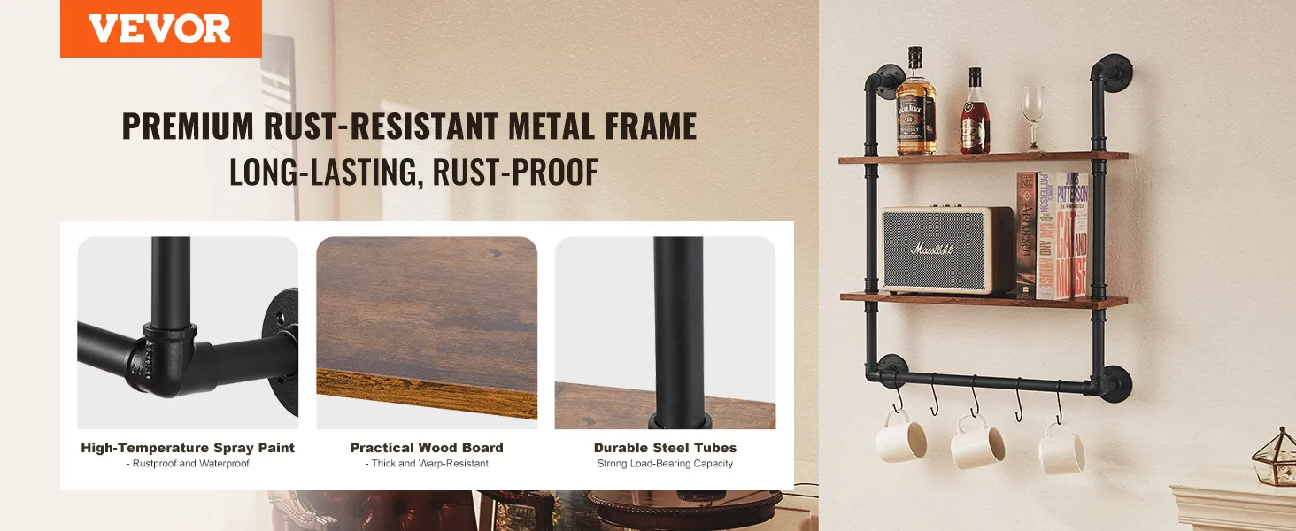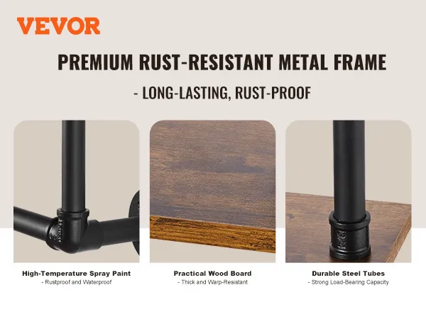 Stevige stalen buizen: deze plank is gemaakt van koolstofstalen buizen van ∅1 inch/25,4 mm, biedt sterke ondersteuning en is breukbestendig, waardoor een veilige en stabiele opslag wordt gegarandeerd. De 15,24 mm dikke houten planken bieden voldoende stabiliteit en bieden plaats aan diverse voorwerpen zonder dat u zich zorgen hoeft te maken dat ze doorbuigen.