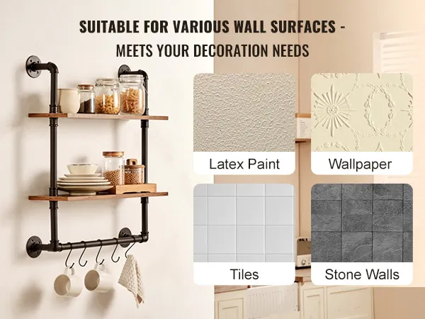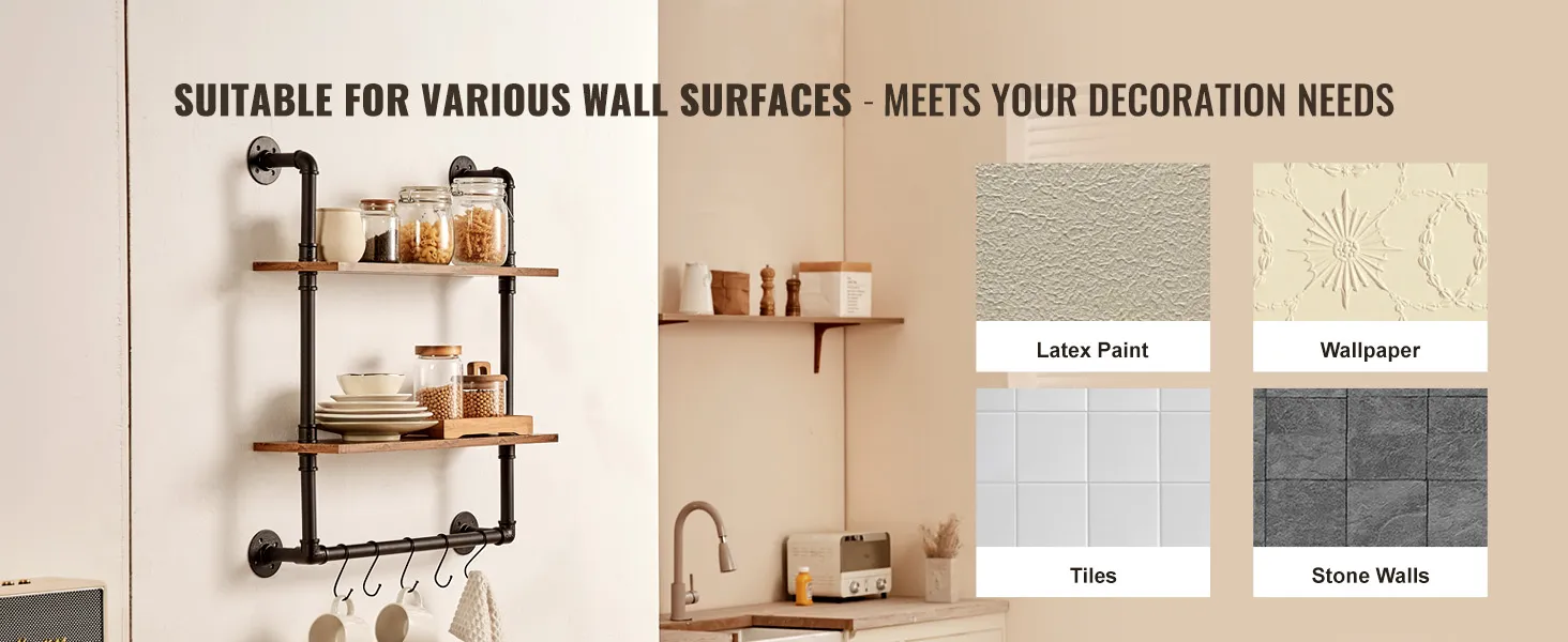 Hoge draagkracht: elke plank is gemaakt van een stevige metalen buisstructuur en verdikte houten planken en kan tot 23 kg dragen, waardoor aan verschillende opslagbehoeften wordt voldaan. Of het nu om boeken, lijsten, keukengerei of handdoeken gaat, houd uw ruimte georganiseerd en netjes!