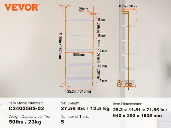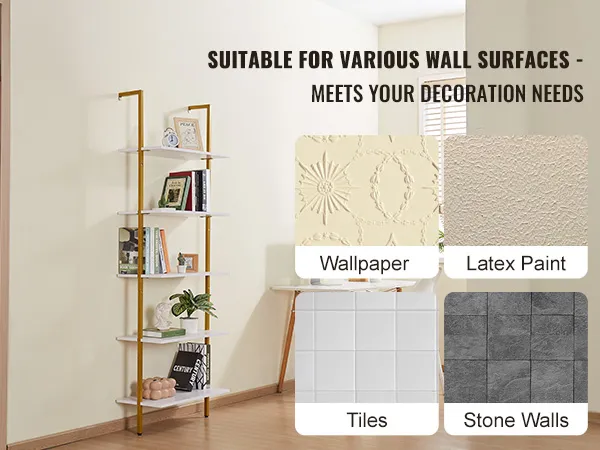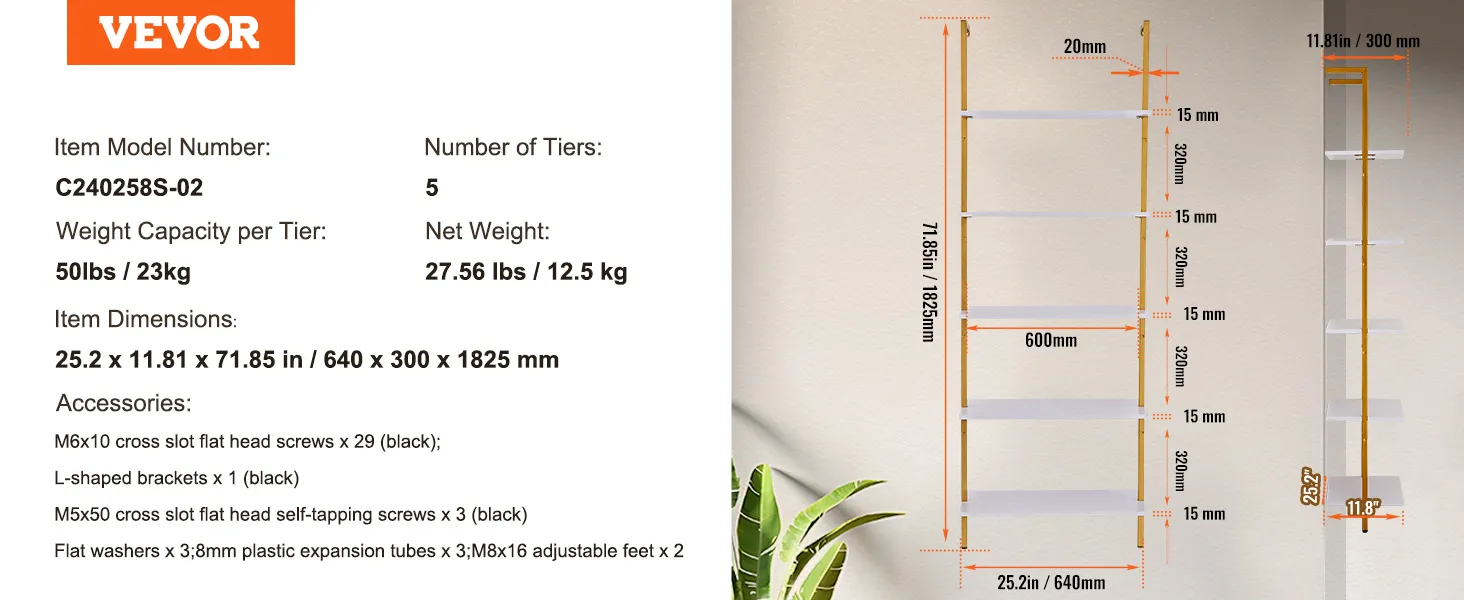 VEVOR Ladder Shelf, 5-Tier Bookshelf 24x11.8in, Open Wall-Mounted Ladder Shelf with Metal Frame,Storage Rack Sundries Holder for Kitchen Bedroom Bathroom Living Room, Gold White