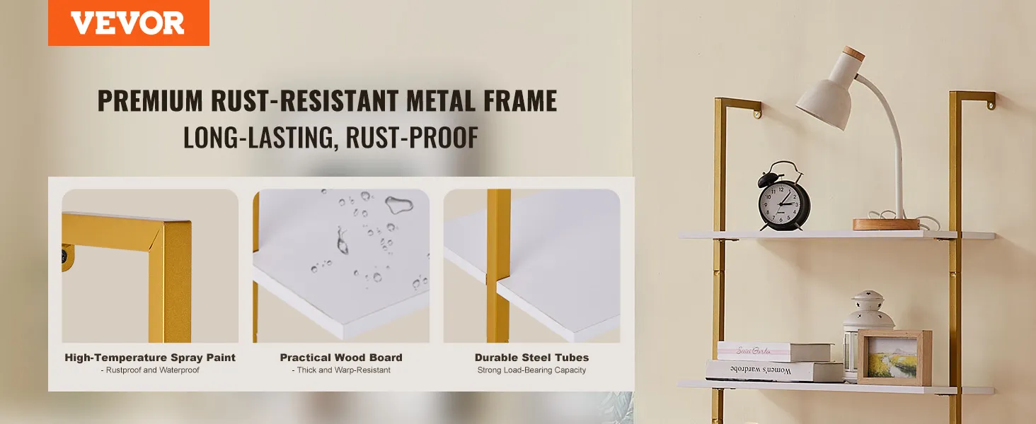 Strong Load Capacity: Constructed with sturdy metal pipes and thickened wood boards, each shelf can hold up to 50 lbs, catering to various storage needs. From books and frames to kitchenware and towels, keep your space organized and free from clutter!
