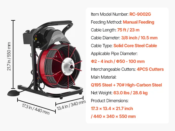 De VEVOR elektrische pijpreinigingsmachine met een 23 m (75 ft) lange en 10,5 mm (3/8 inch) dikke massieve kabel zorgt voor een snelle en efficiënte pijpreiniging.