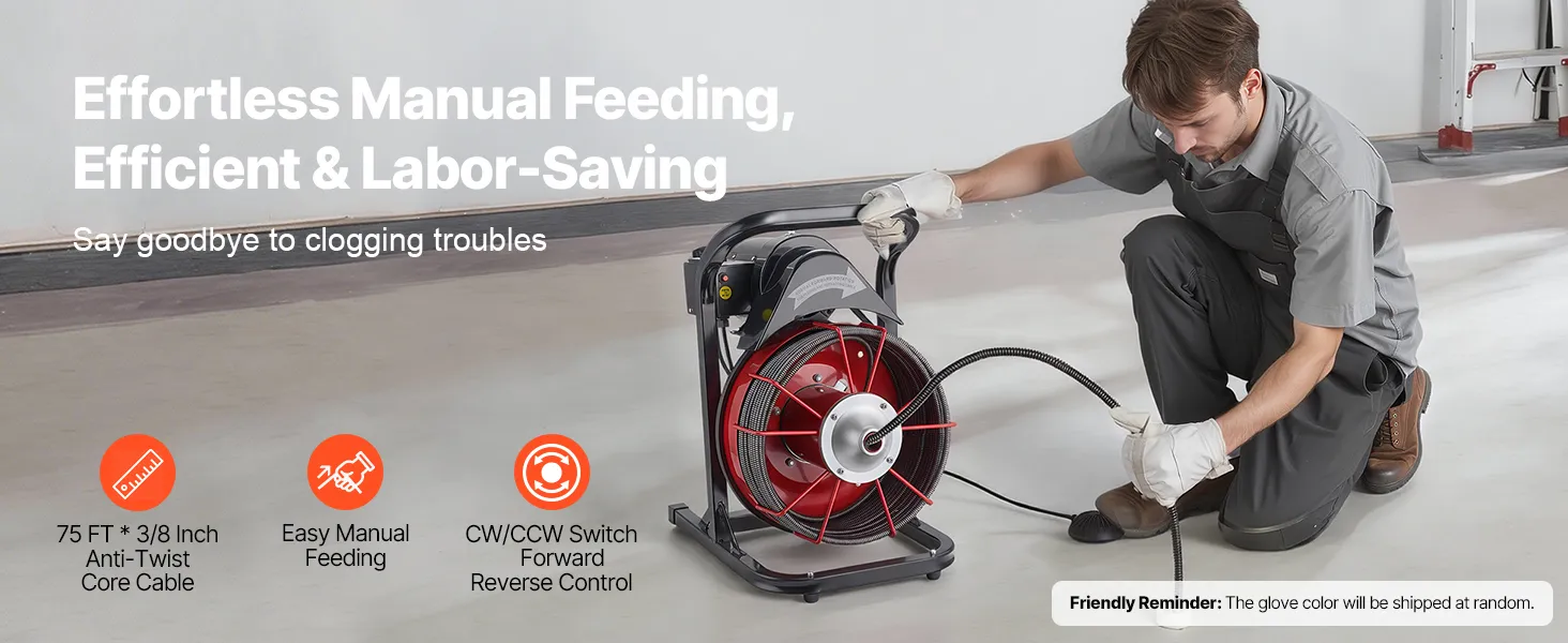 Hardnekkige verstoppingen verhelpen: De VEVOR pijpreinigingsmachine is voorzien van een handmatig invoersysteem waarbij de kabel handmatig in en uit de pijp moet worden gestoken. Dankzij de draaiing met de klok mee/tegen de klok in en de pneumatische voetschakelaar is het aanleggen van de kabel moeiteloos.