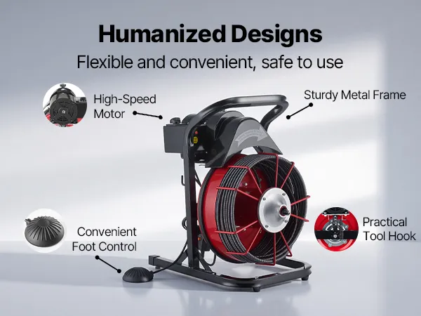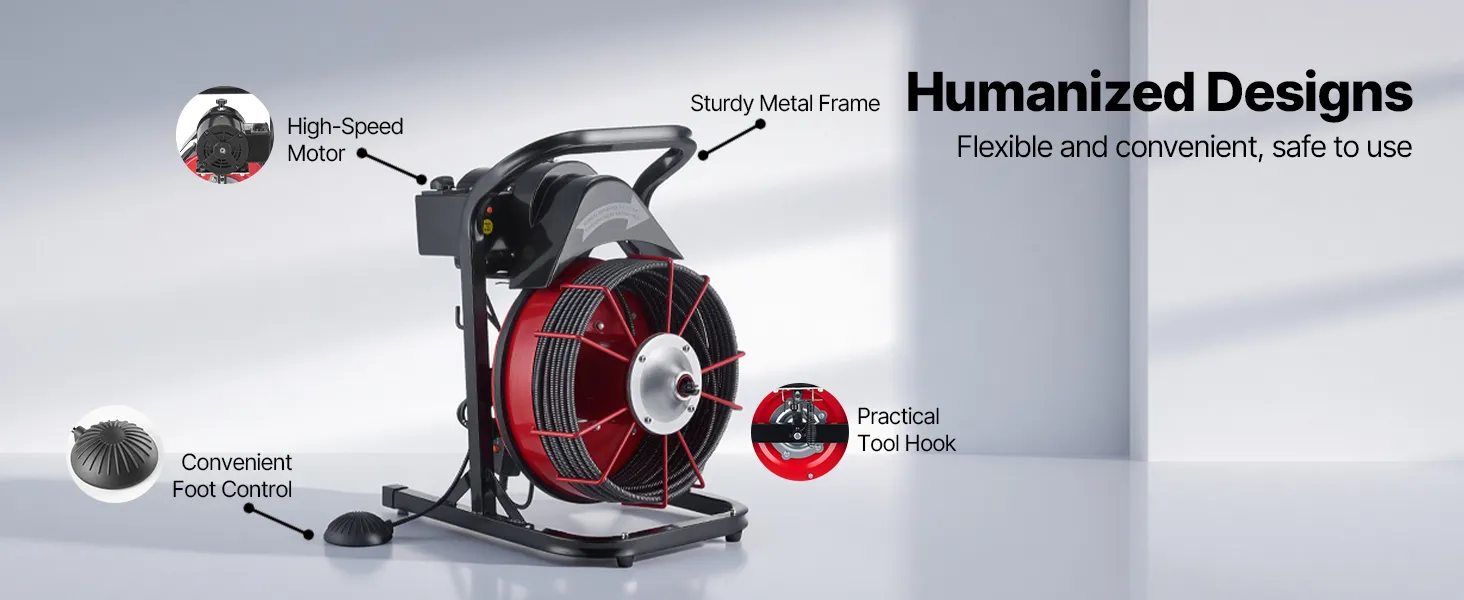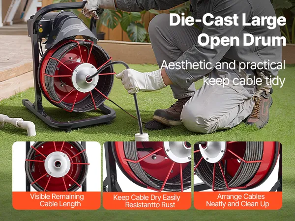 Praktisch open ontwerp: Het pijpreinigingsapparaat heeft een open trommel waardoor de kabel tijdens gebruik goed zichtbaar is. Dit maakt het eenvoudig om de resterende kabellengte in de gaten te houden en vermindert het risico op knopen of in de war raken van de kabel.