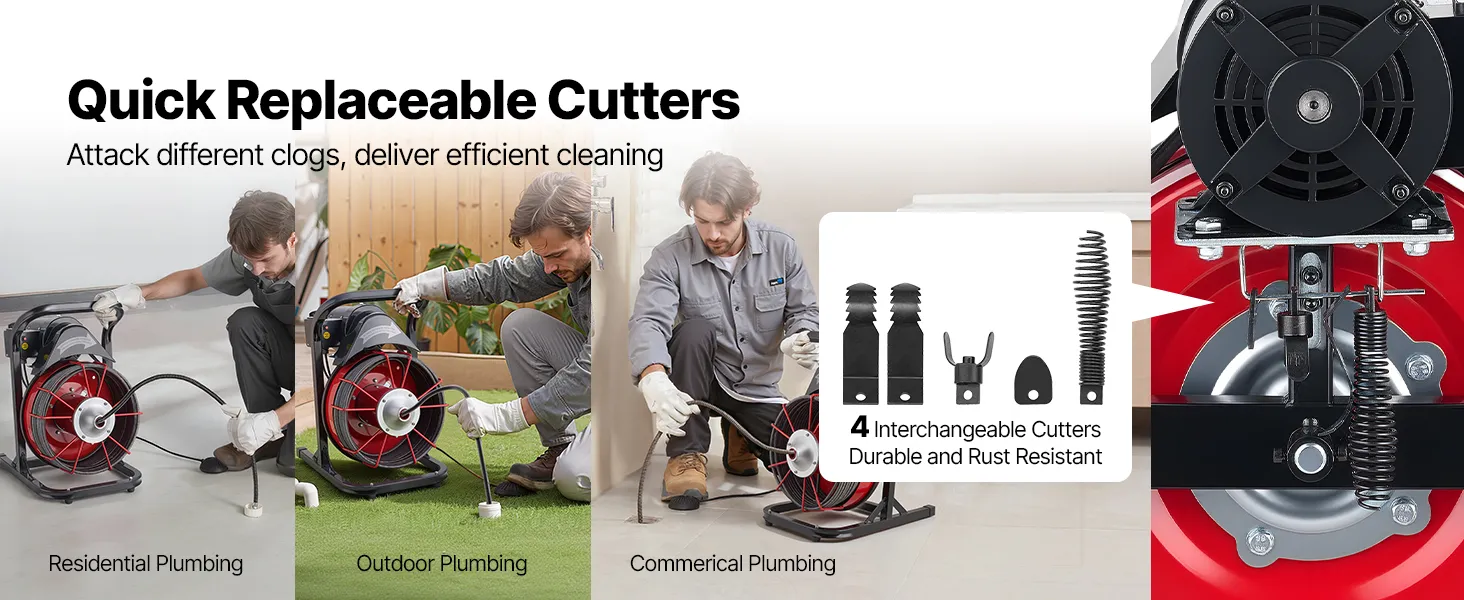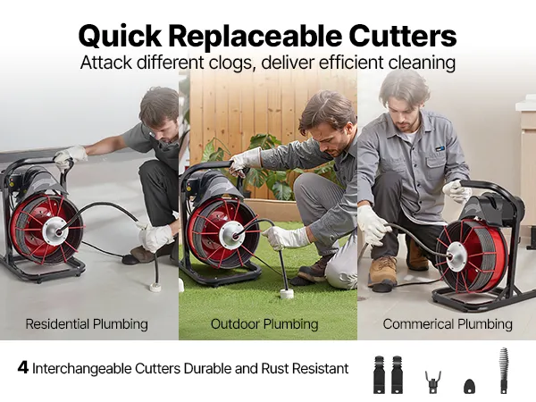 Verwisselbare snijkoppen: Uitgerust met 4 snijkoppen voor het gericht verwijderen van verschillende soorten verstoppingen. Onze elektrische ontstoppingsspiraal is ideaal voor het reinigen van afvoerbuizen, gootstenen en toiletten, waardoor tijdrovend onderhoud wordt vereenvoudigd en onaangename geuren worden geëlimineerd.
