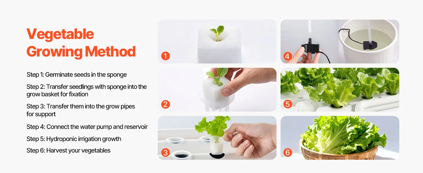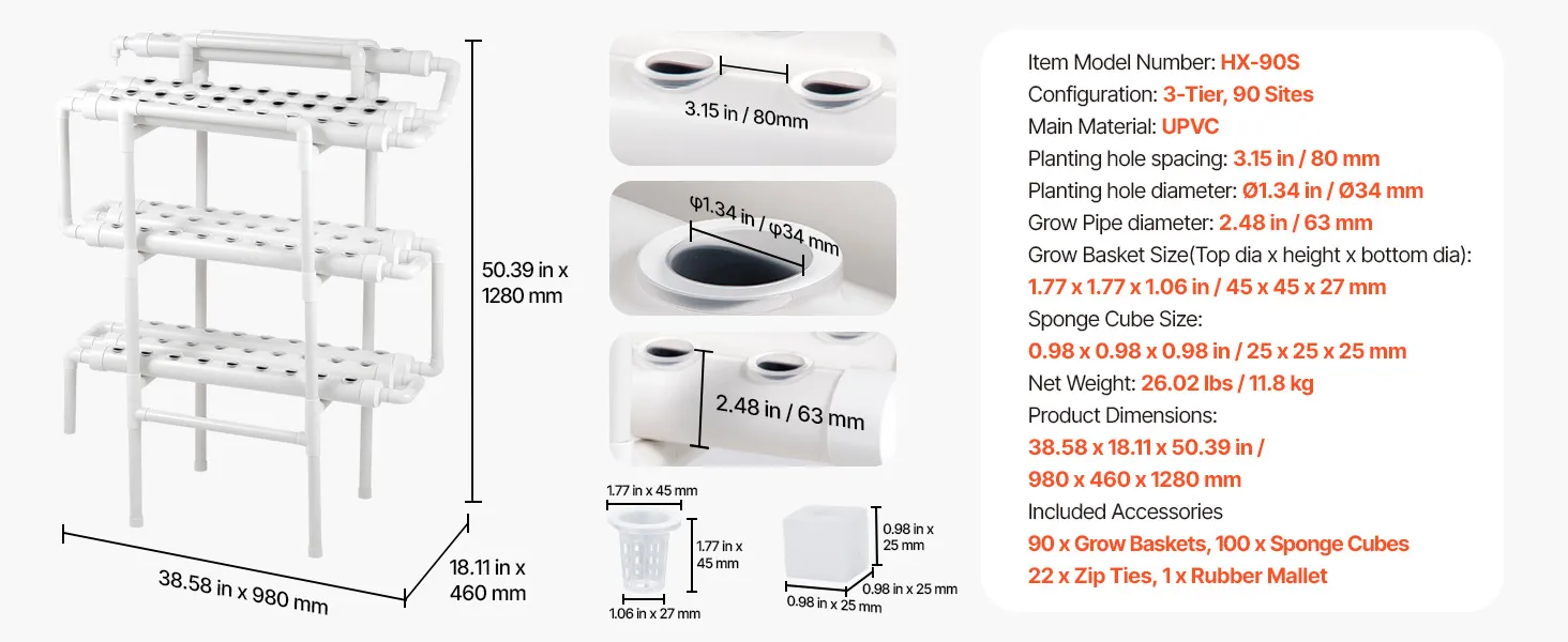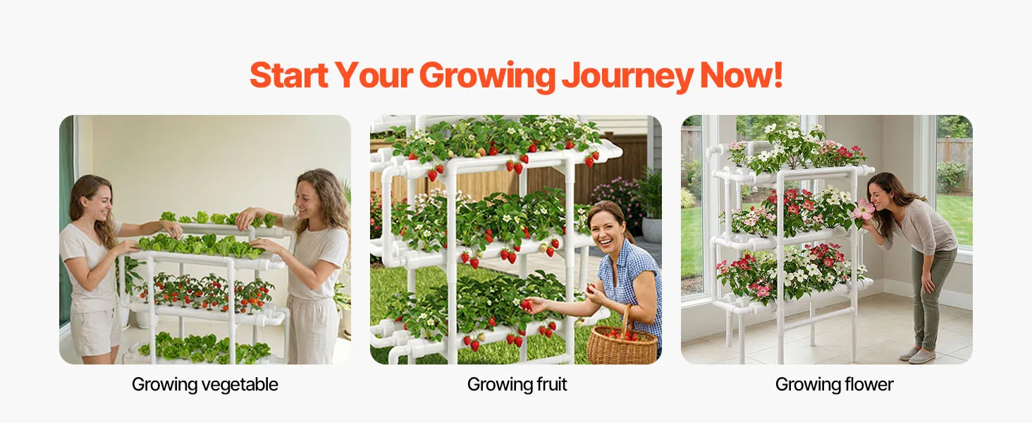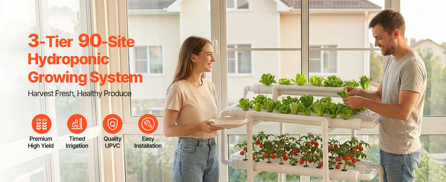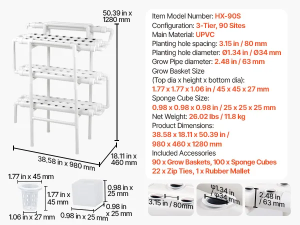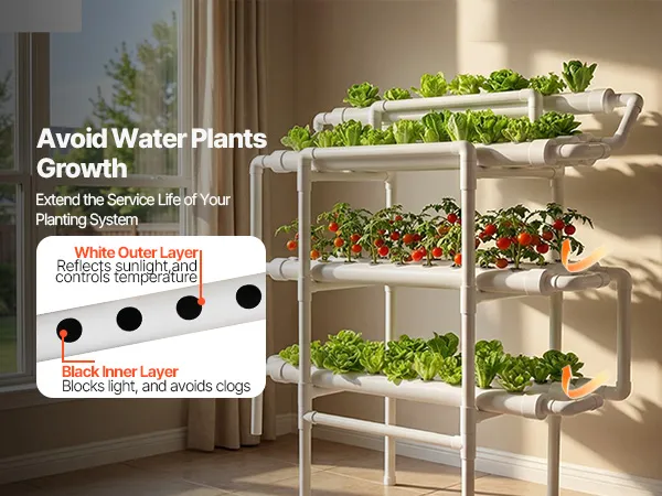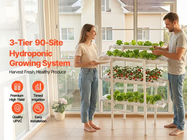 Hoge opbrengst, topkwaliteit: De drielaagse hydrocultuurbuizen met 90 plantvakken bevorderen de plantengroei. Ze maximaliseren het ruimtegebruik in vergelijking met kweken in aarde. Schoner, duurzamer en ideaal voor het kweken van sla, fruit en bloemen thuis of in een kas.