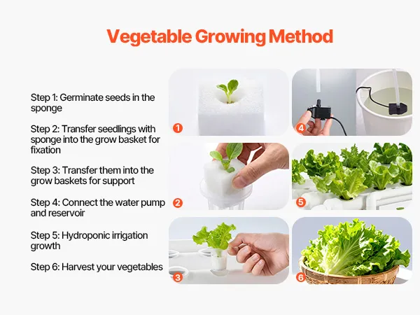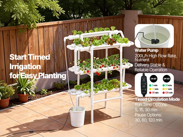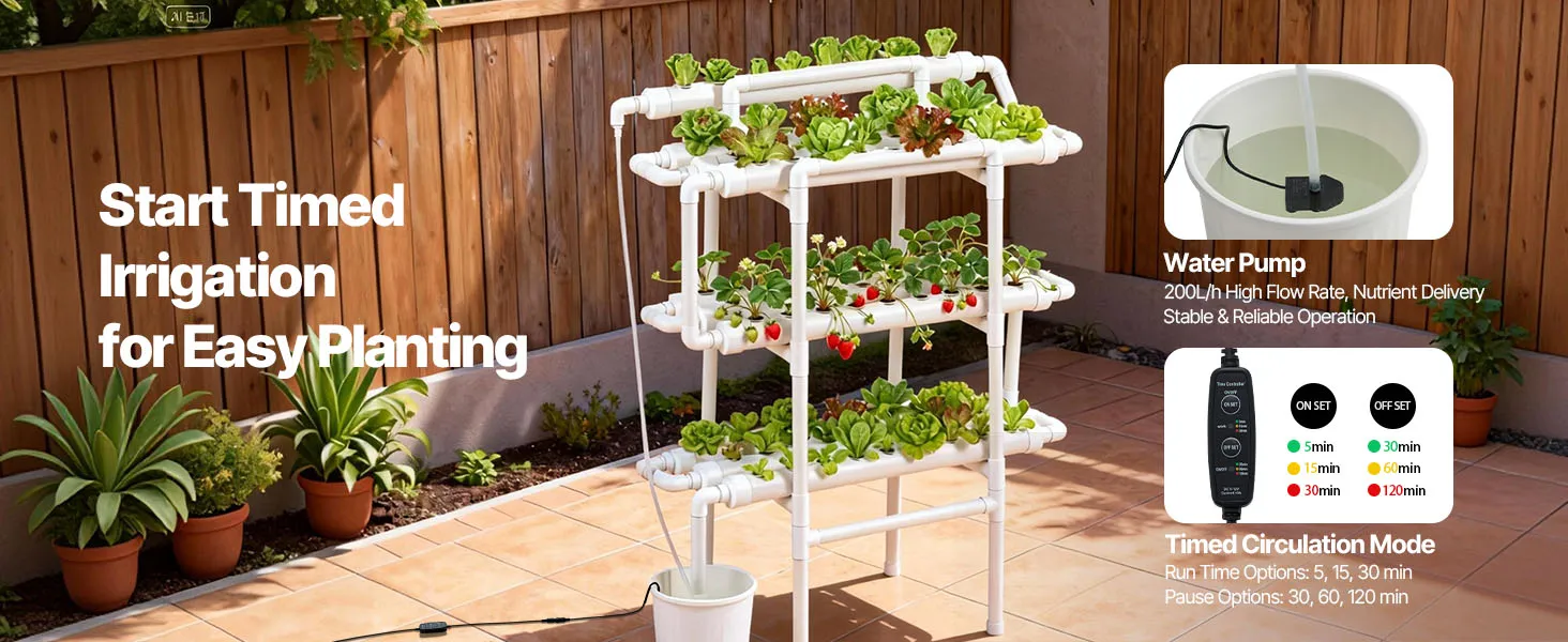 Geautomatiseerd bewateringssysteem: Uitgerust met een 4W waterpomp en een timer voor efficiënte watercirculatie, waardoor planten voedingsstoffen beter kunnen opnemen. De hydrocultuurset bevat een 24-uurs timer die u in het stopcontact kunt steken, zodat u automatische aan/uit-cycli kunt instellen voor eenvoudig gebruik.