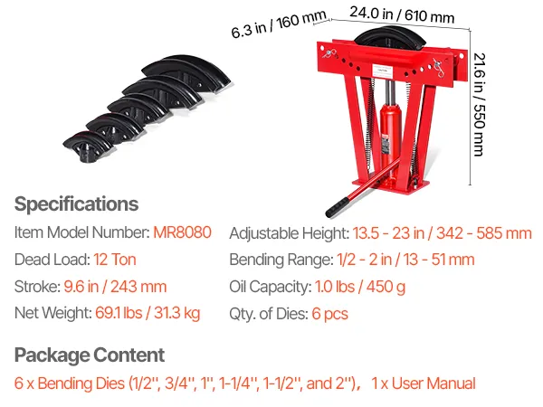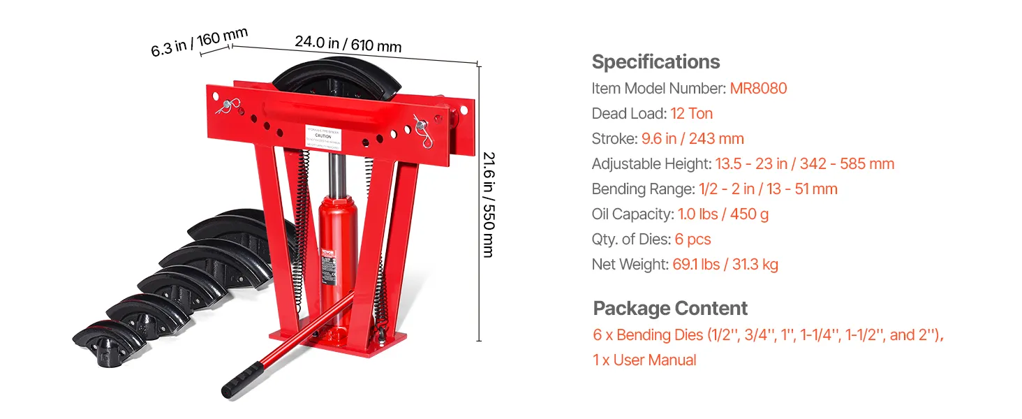 High-Quality Dies & 90°-180° Bending: VEVOR 12-ton hydraulic pipe bender comes with 6 precision casting dies (1/2", 3/4", 1", 1-1/4", 1-1/2", 2") to accommodate various pipe sizes. With 6 slots on both sides, the rollers feature 6 adjustable positions to meet 90°-180° different bending angles.