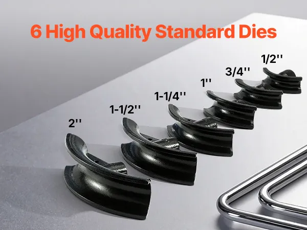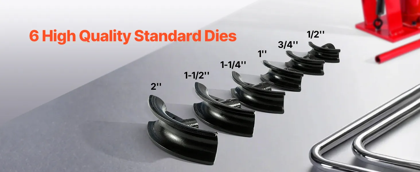 This heavy-duty pipe bending tool comes with 6 precision-cast dies in sizes of 1/2", 3/4", 1", 1-1/4", 1-1/2", and 2". Additionally, the rollers are adjustable in 6 levels to accommodate different pipe bending angles.