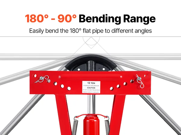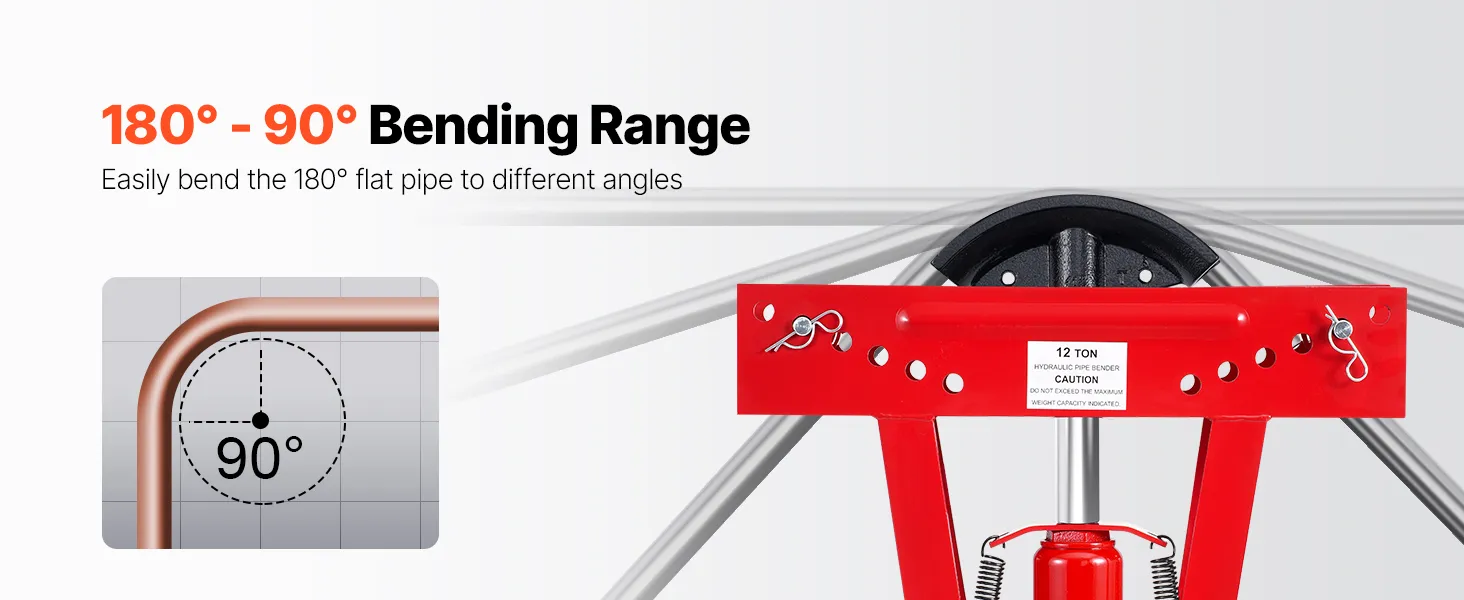 Elevate your bending tasks with our 12-ton hydraulic pipe bender. It comes with 90°-180° bending range, 6 precision dies, adjustable roller levels, and 4-leg stable support (PLEASE NOTE: The pipes cannot be bent to 90° all at once, and need to be bent to 90° gradually in sections.)
