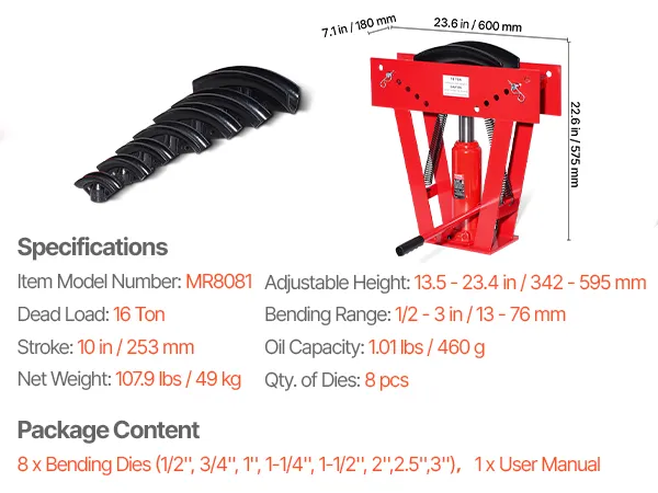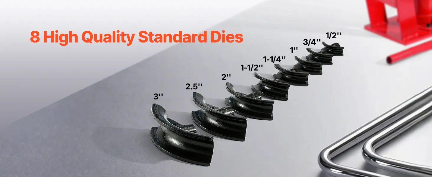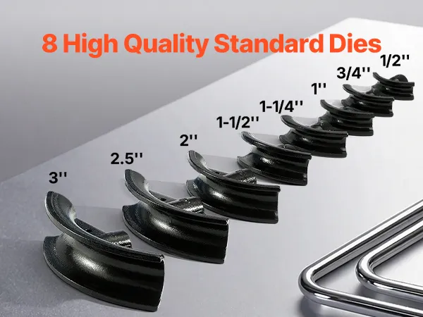 Hoogwaardige matrijzen en 90°-180° bocht: onze hydraulische pijpenbuiger van 16 ton wordt geleverd met 8 precisiegietmatrijzen (1/2, 3/4, 1, 1-1/4, 1-1/2, 2, 2,5 , 3 inch) geleverd voor verschillende buismaten. Met 6 sleuven aan beide zijden hebben de rollen 6 verstelbare posities om verschillende buighoeken van 90°-180° te bereiken.