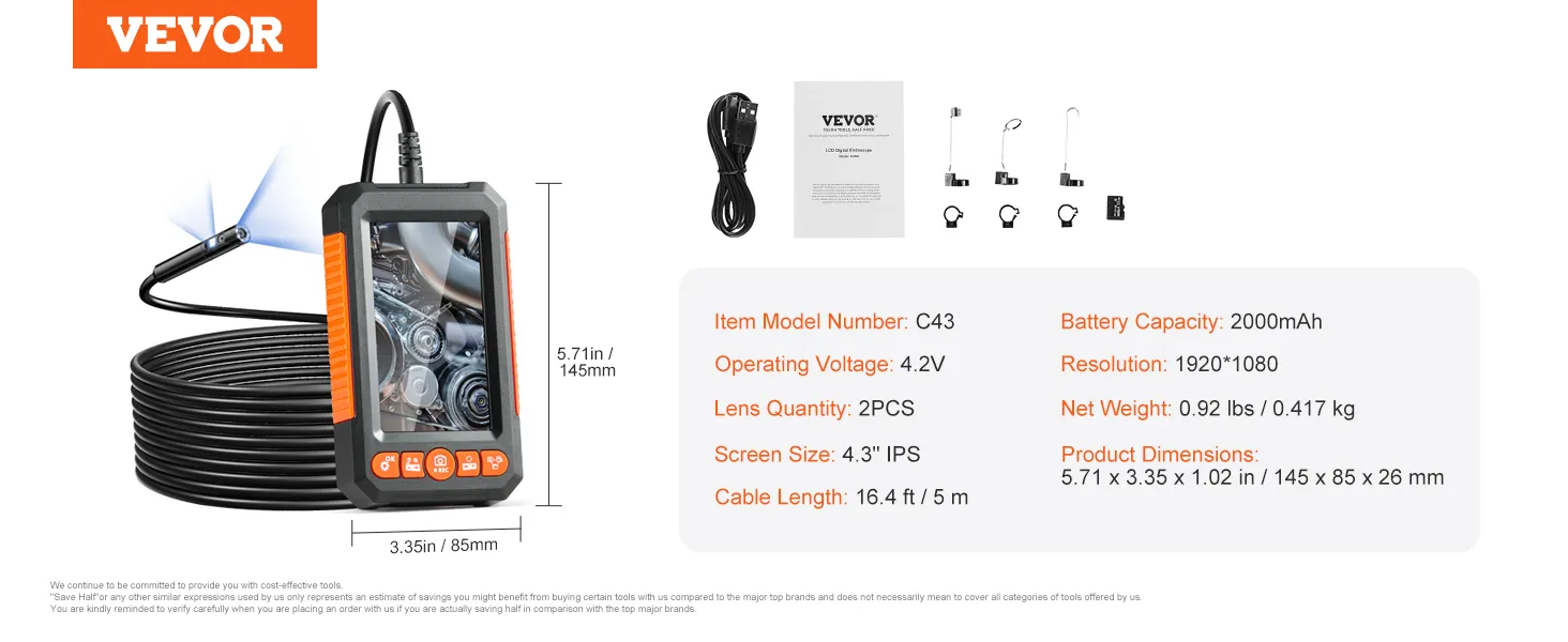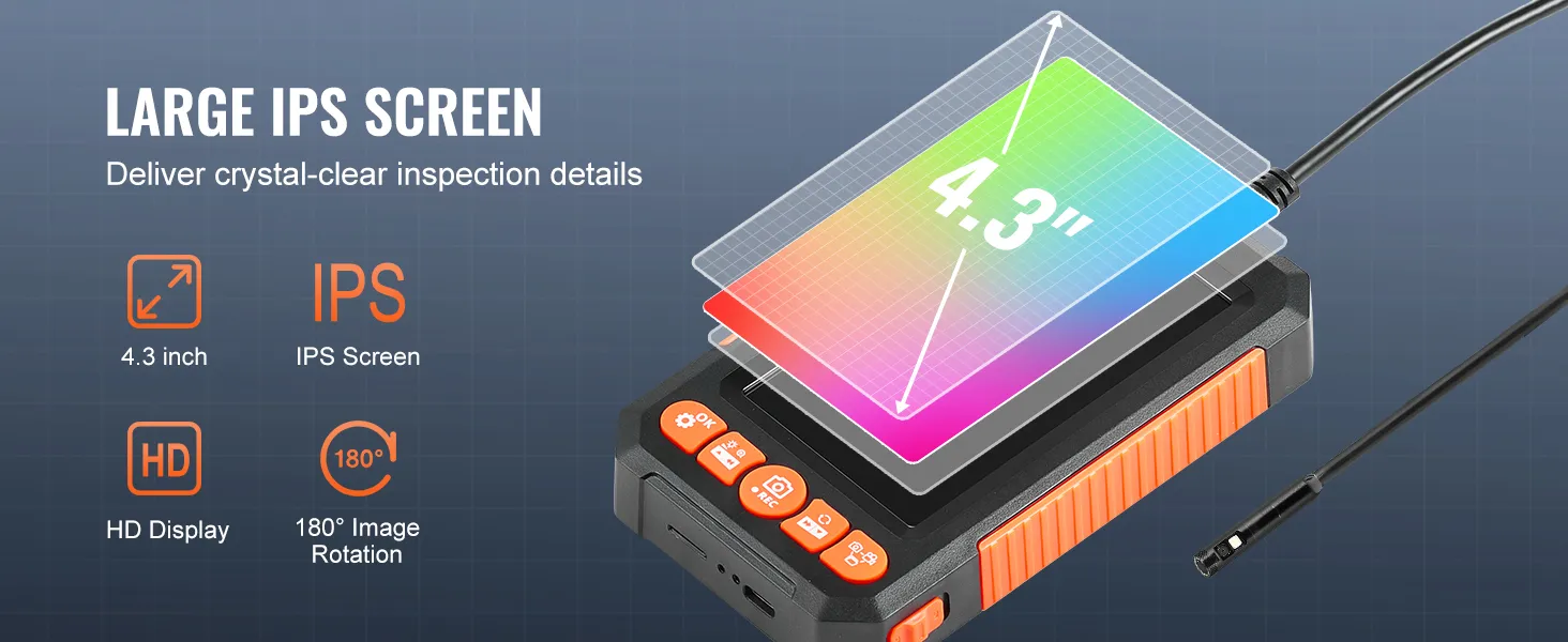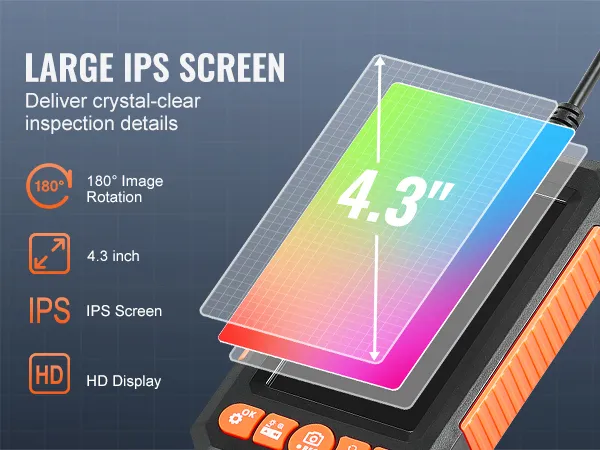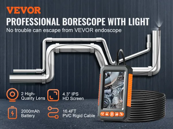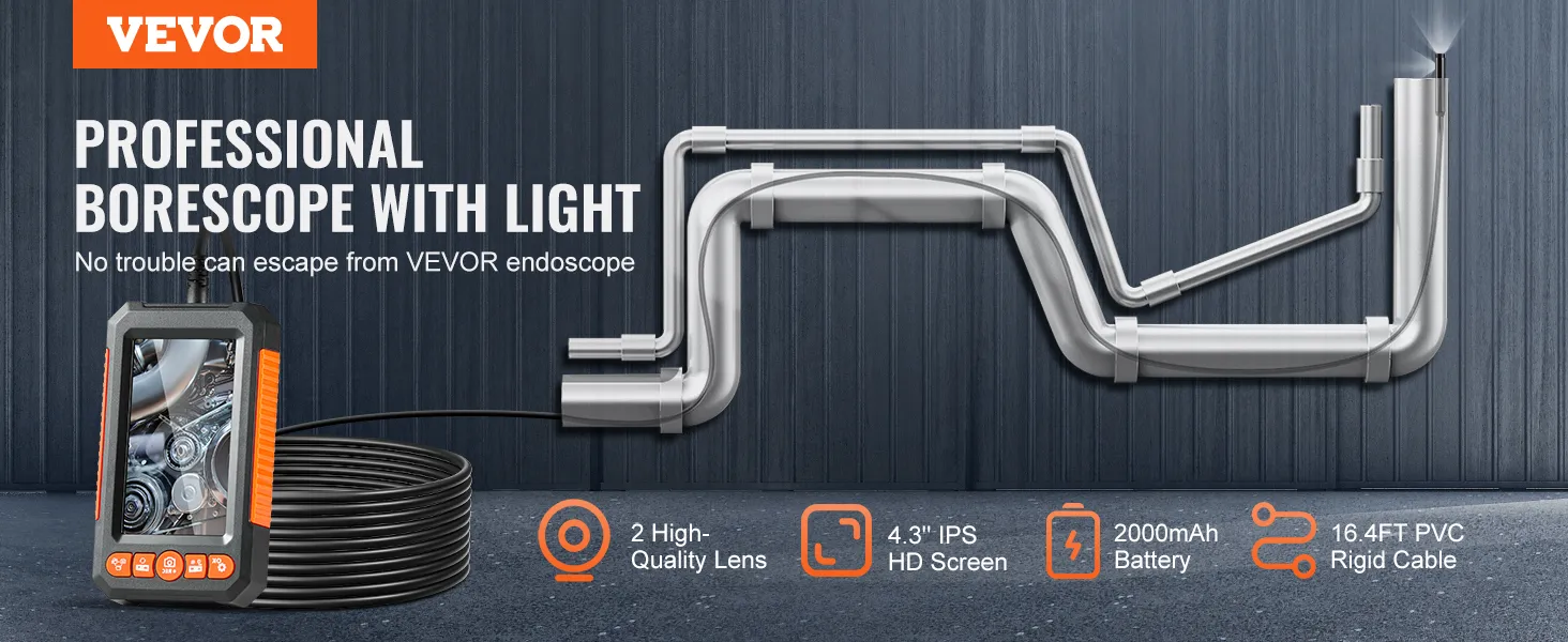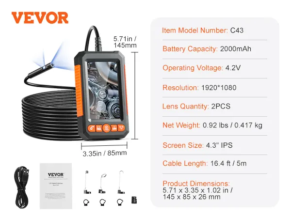 Deze endoscoopcamera met dubbele lens geeft u een breder zicht. U kunt tussen de twee opties schakelen voor een foto of video. De flexibele kabel van 5 meter stelt u in staat om krappe ruimtes in voertuigen, muren en leidingen te bereiken. Het 4,3-inch lcd-scherm biedt realtime video terwijl u werkt. De waterdichte, dunne sonde is geschikt voor natte ruimtes.