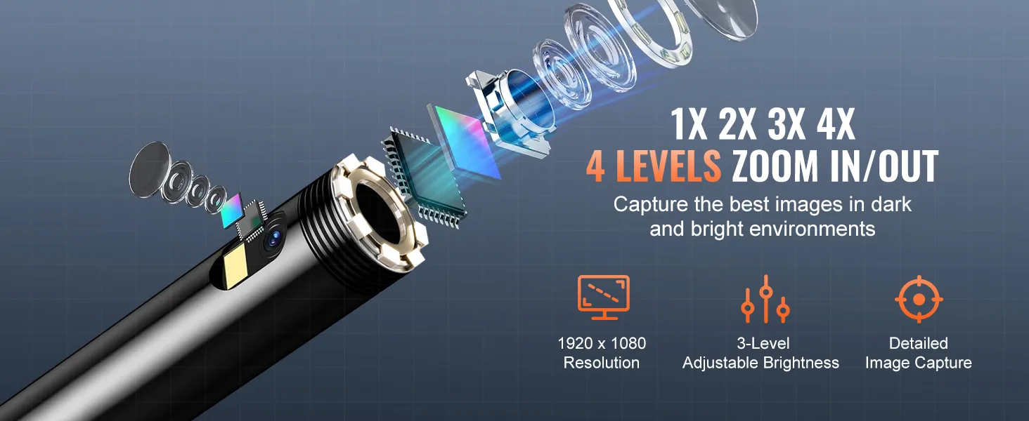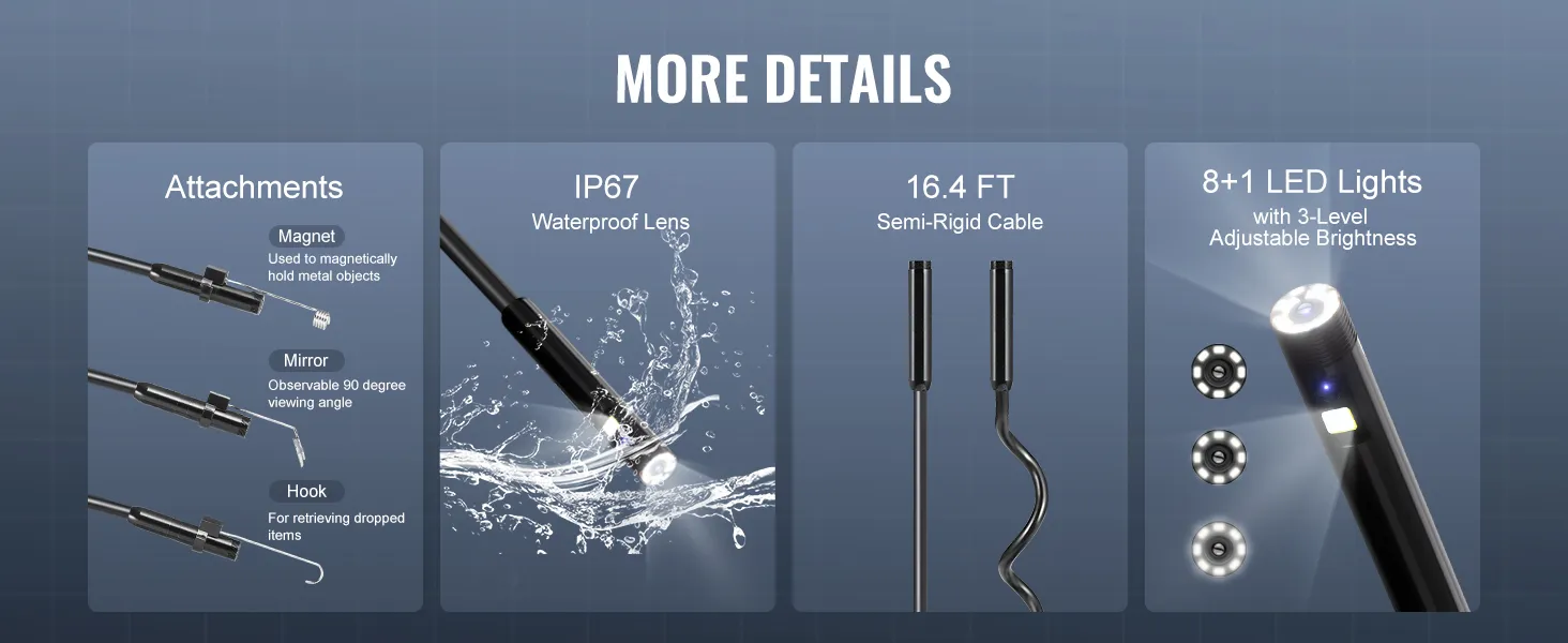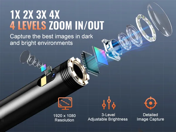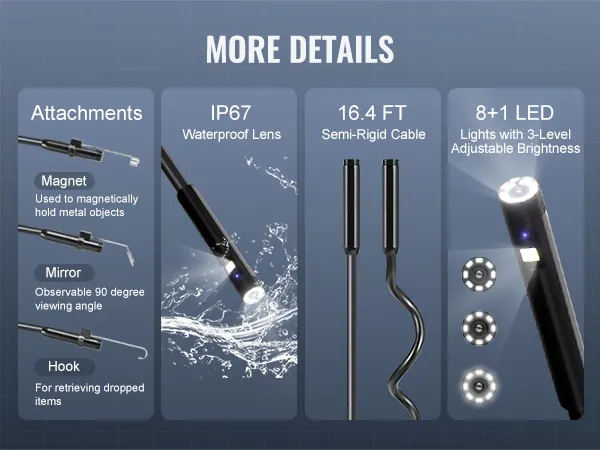 Heldere led-lampjes zorgen voor goed zicht in donkere ruimtes. De lens met hoge resolutie zorgt voor scherpe foto's en video's. Je kunt ze opslaan op het apparaat of overzetten via USB. Geschikt voor auto-, loodgieters- en klussen in huis. Hij is lichtgewicht, compact en overal mee naartoe te nemen.