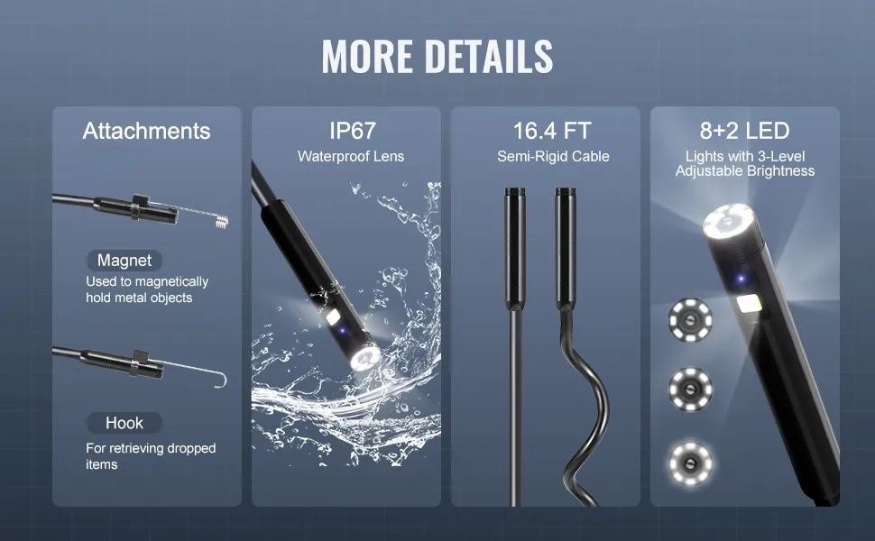 De endoscoopcamera beschikt over 8 + 2 lampen met 3 instelbare helderheidsniveaus om voldoende licht te bieden in donkere situaties. Hij biedt een breder gezichtsveld, realtime HD-inspectie en scherpere beelden.