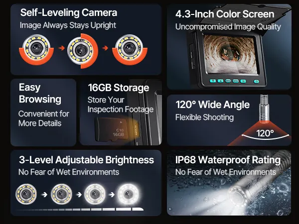 De VEVOR 50m (164ft) zelfnivellerende inspectiecamera voor leidingen versnelt en vereenvoudigt leidinginspecties aanzienlijk! Uitgerust met een 4,3-inch HD-scherm, kabellengtemarkeringen, 12 verstelbare LED's en een 4500mAh-accu, is het de professionele oplossing voor inspecties van zwembadleidingen, rioleringssystemen, HVAC-installaties en nog veel meer.