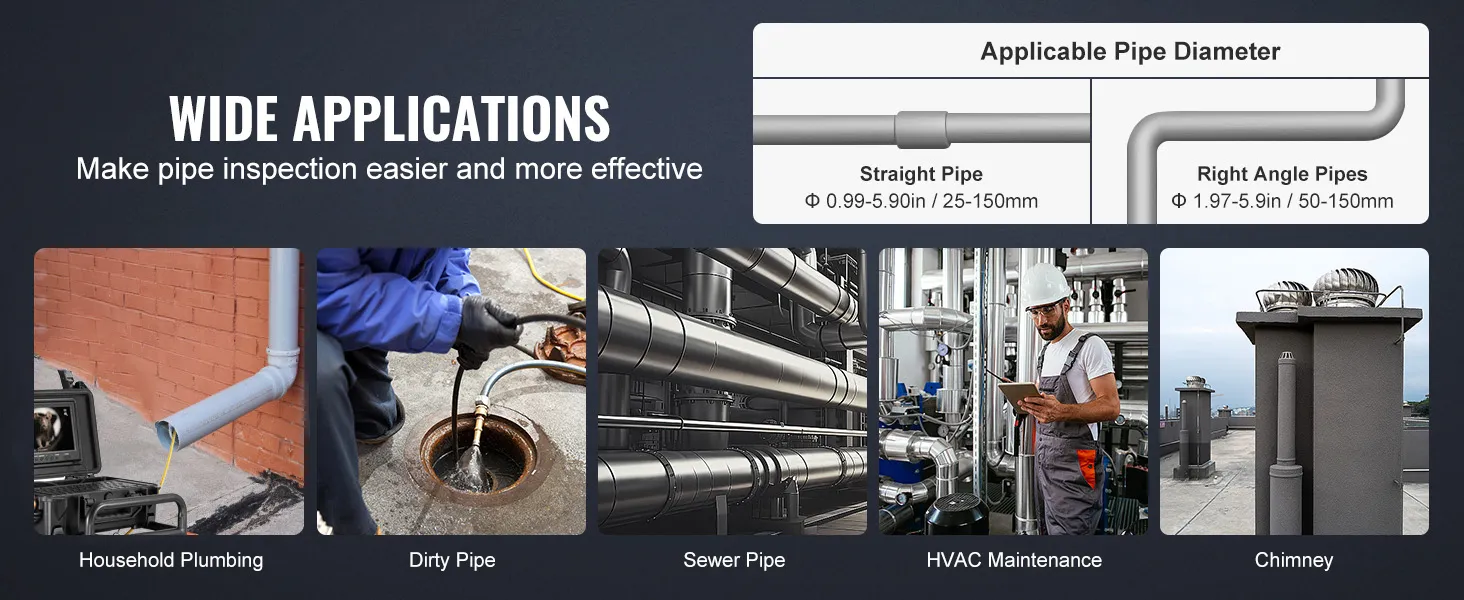 Robust Semi-Rigid Cable: Our 165FT semi-rigid snake cable is perfect for 99.9% of medium to large-sized pipeline repair projects. Made of robust fiberglass, it easily navigates bends and long pipes, excelling in passability and resilience even in dark, damp conditions. Compatible Pipe Diameters: Straight Pipes: Φ 0.99 - 5.90 in / 25 - 150 mm; Right Angle Pipes: Φ 1.97 - 5.90 in / 50 - 150 mm.