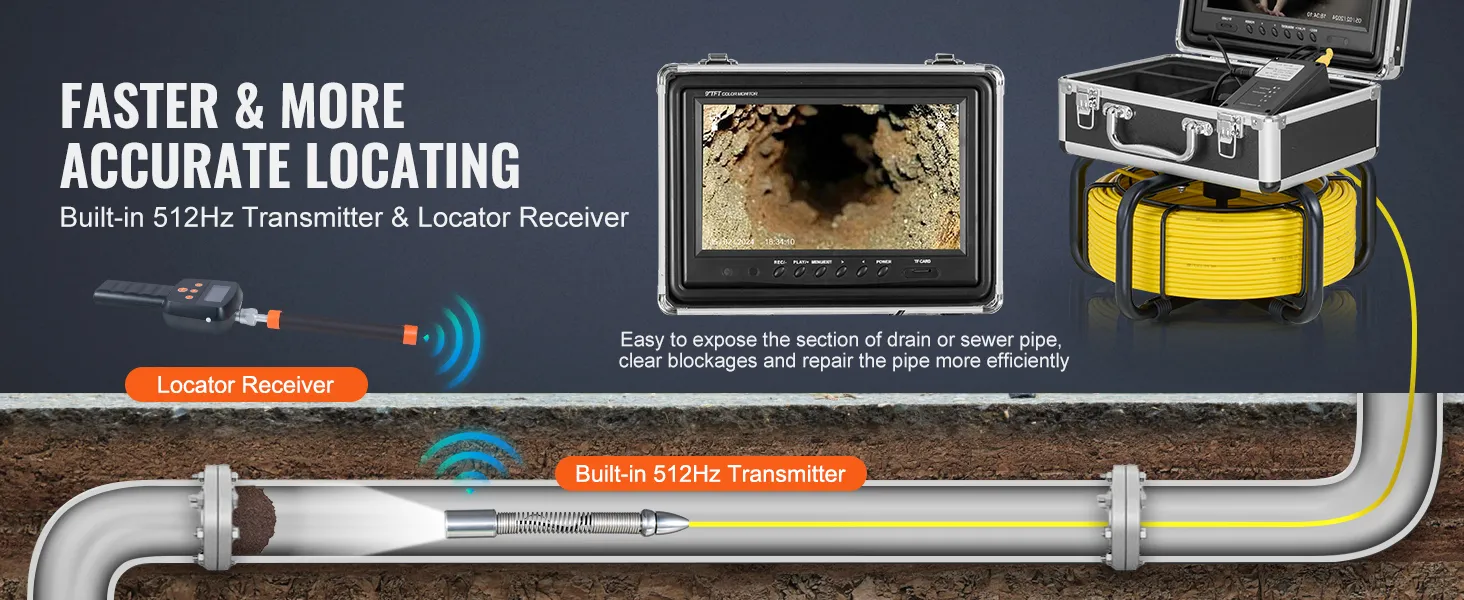VEVOR 165FT sewer camera with 512Hz locator - make pipe inspections faster and easier! Featuring 9-inch HD screen, self-leveling camera, cable length markings, 12PCS adjustable LEDs, it is the ultimate professional solution for inspecting sewers, drain pipes, and chimneys with precision.