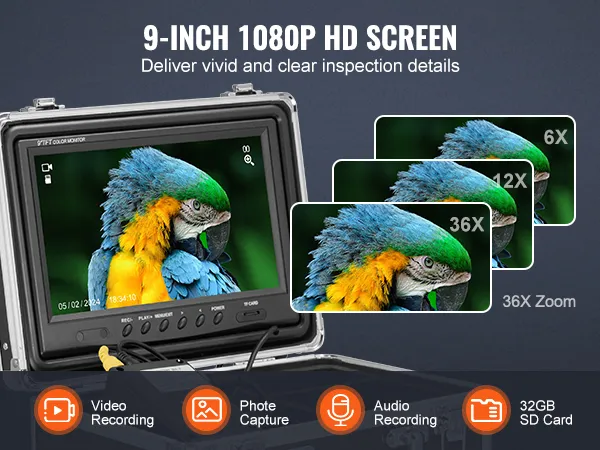 Crystal-Clear 9-inch Screen: 9-inch large screen makes operation simple—just press the button to record HD video, capture clear images, or play back audio through your computer or headphones. 1080P HD display provides vivid and clear inspection details ; 32GB SD card provides plenty of storage for photos/videos ; and the included sunshade keeps the screen clearly visible even in bright sunlight.