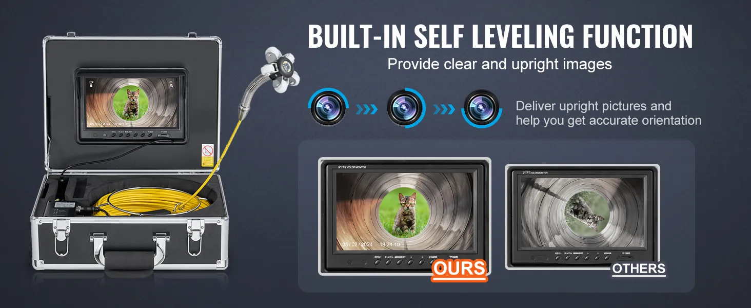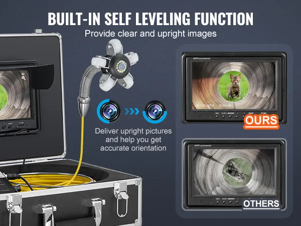 Deze rioolinspectiecamera heeft een ingebouwde zelfnivellerende functie die zorgt voor een rechtopstaande beeldweergave. In tegenstelling tot andere camera's die ondersteboven beelden weergeven, houdt de VEVOR-camera het beeld in de juiste richting.