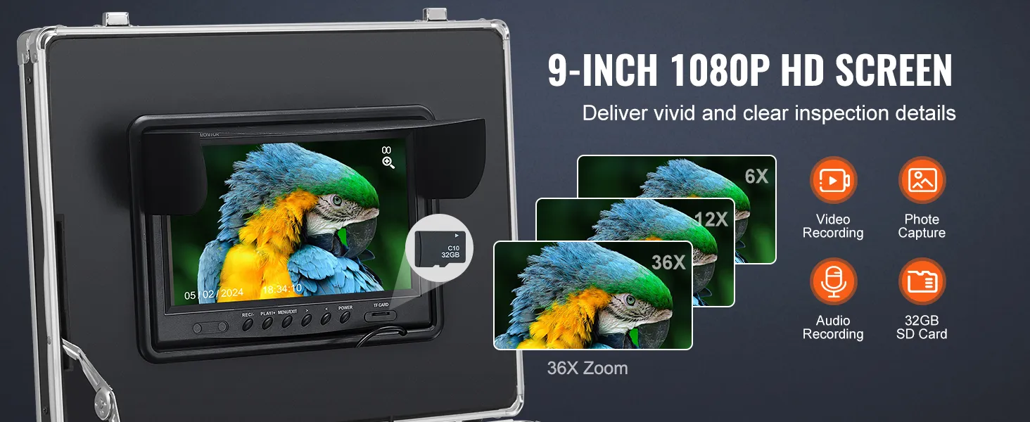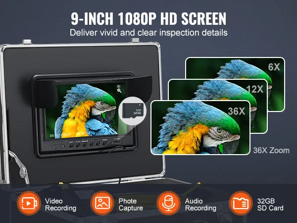 Levendig HD-scherm: het 9-inch grote scherm vereenvoudigt de bediening: druk gewoon op de knop om HD-video op te nemen, heldere beelden vast te leggen of audio af te spelen via uw computer of hoofdtelefoon. Het 1080P HD-scherm biedt levendige en duidelijke inspectiedetails; de SD-kaart van 32 GB biedt voldoende opslagruimte voor foto's/video's; en het meegeleverde zonnescherm zorgt ervoor dat het scherm ook bij fel zonlicht goed zichtbaar is.