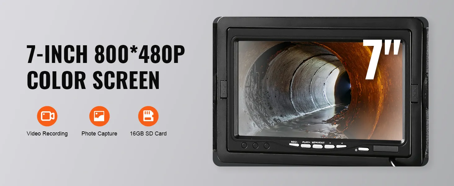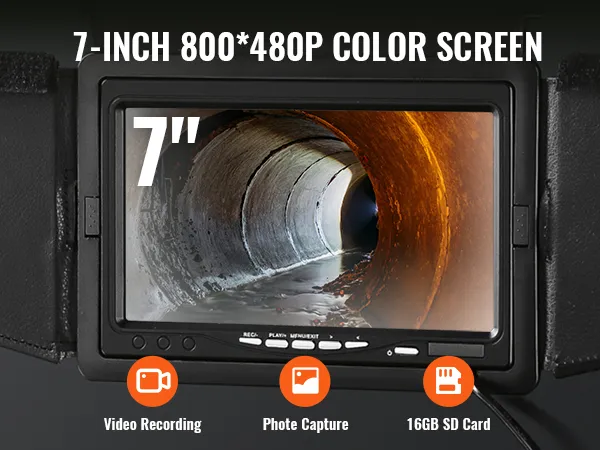 Helder 7" scherm: Uitgerust met een 7" LCD-kleurenscherm legt deze pijpcamera duidelijkere, realistischere details vast, zodat u gemakkelijk de binnenkant van pijpen kunt bekijken. Het ondersteunt ook video-opnamen en het maken van foto's, waarbij een SD-kaart van 16 GB voldoende opslagruimte biedt om talloze inspectievideo's en afbeeldingen op te slaan.