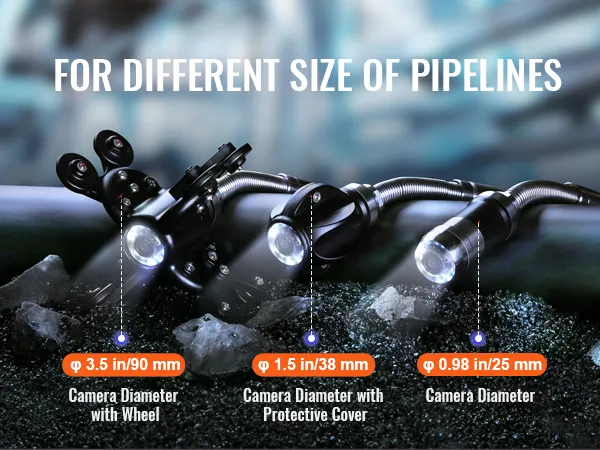 De diameter van de 1000TVL rioolcamera is 25 mm. Compatibele buisdiameters: Rechte buizen: 30 - 200 mm (1,18 - 7,87 inch); Rechte hoekbuizen: 1,97-7,87 inch (50 - 200 mm).