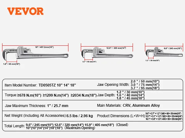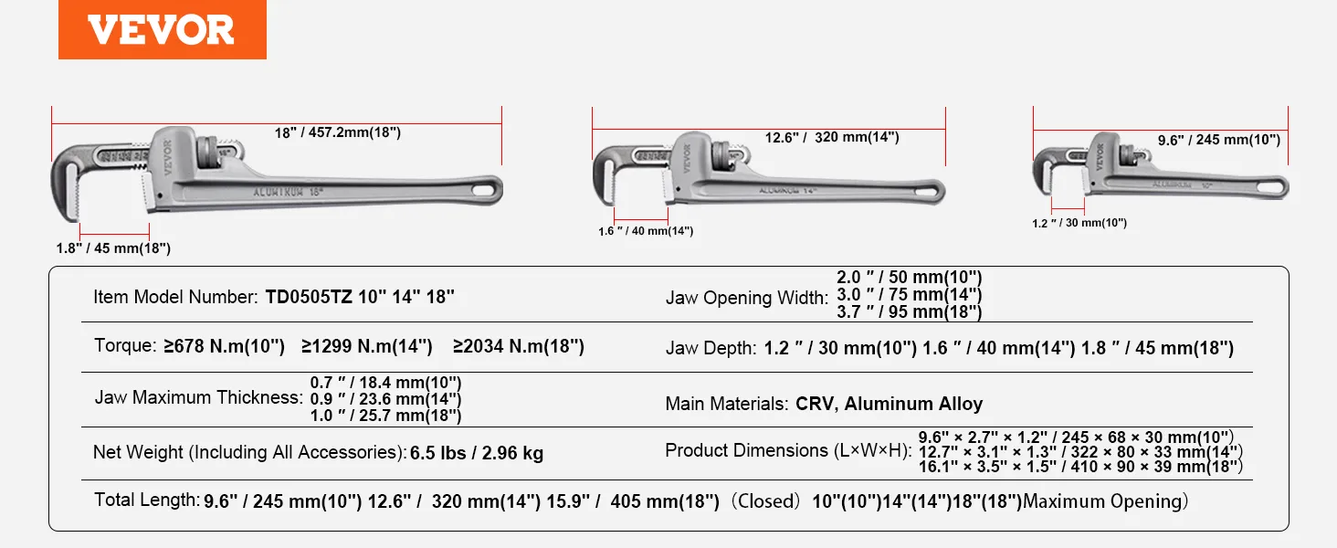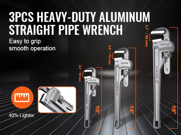Wide Application: The set of 3 aluminum straight pipe wrenches in sizes 10 inches, 14 inches, and 18 inches is suitable for all your piping and mechanical needs. Ideal for tasks requiring fastening, loosening, or adjusting threaded connections in mechanical manufacturing, automotive repair, construction, and plumbing.